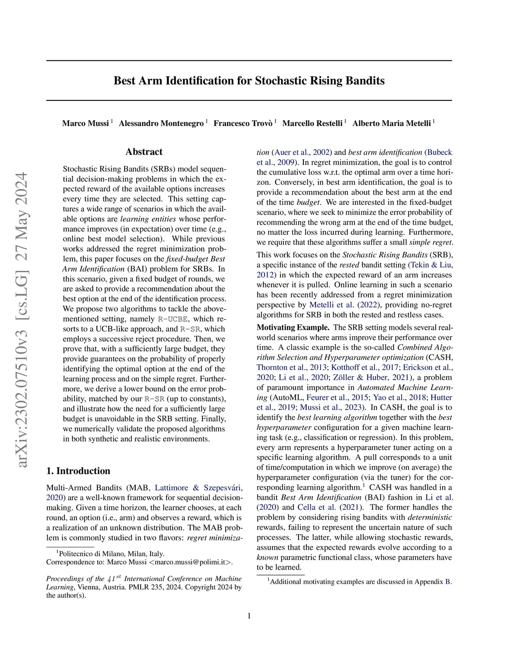 Stochastic Rising Bandits (SRBs) model sequential decision-making problems in which the expected reward of the available options increases every time they are selected. This setting captures a wide range of scenarios in which the available options are learning entities whose performance improves (in expectation) over time (e.g., online best model selection). While previous works addressed the regret minimization problem, this paper focuses on the fixed-budget Best Arm Identification (BAI) problem for SRBs. In this scenario, given a fixed budget of rounds, we are asked to provide a recommendation about the best option at the end of the identification process. We propose two algorithms to tackle the above-mentioned setting, namely R-UCBE, which resorts to a UCB-like approach, and R-SR, which employs a successive reject procedure. Then, we prove that, with a sufficiently large budget, they provide guarantees on the probability of properly identifying the optimal option at the end of the learning process and on the simple regret. Furthermore, we derive a lower bound on the error probability, matched by our R-SR (up to constants), and illustrate how the need for a sufficiently large budget is unavoidable in the SRB setting. Finally, we numerically validate the proposed algorithms in both synthetic and realistic environments.