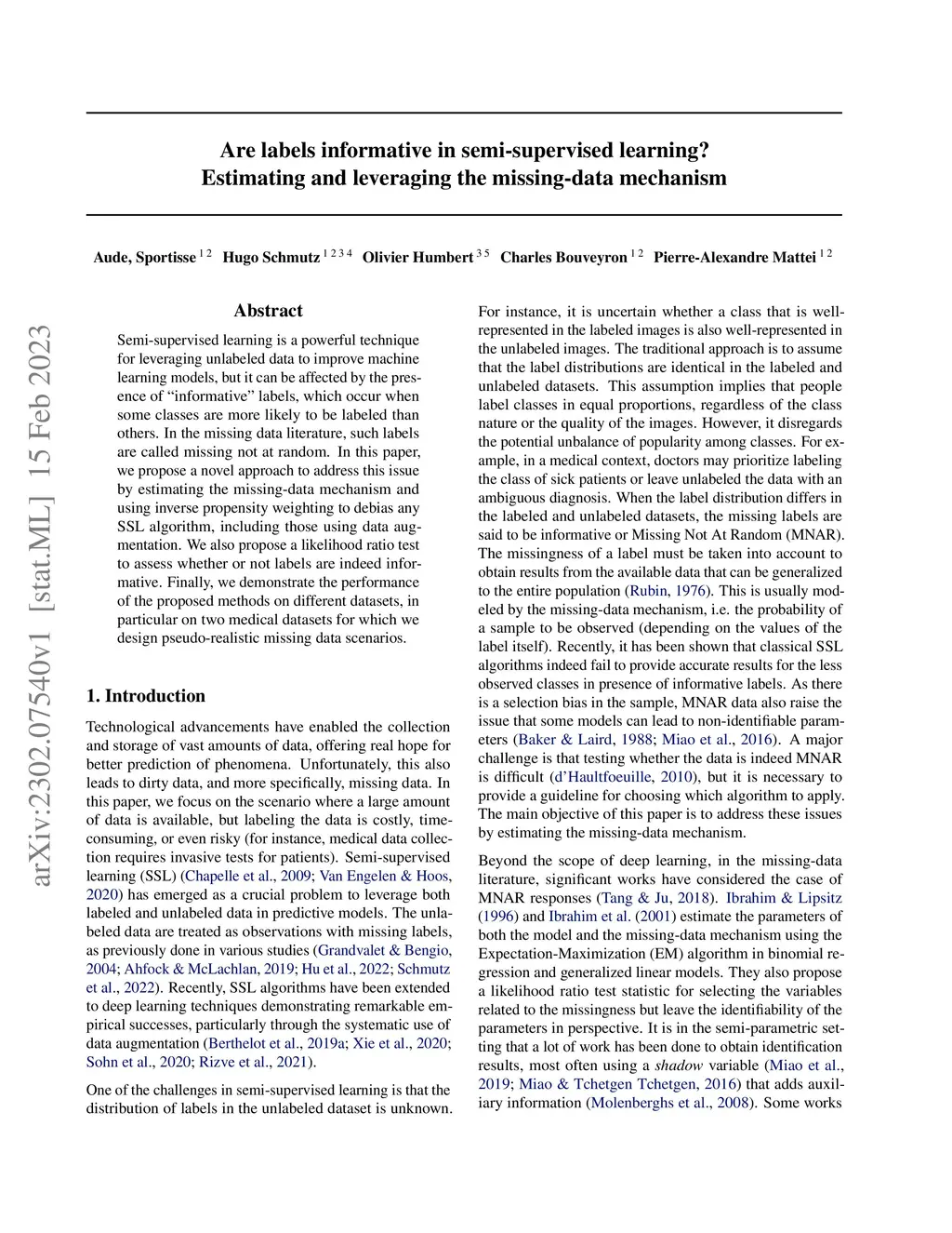 Semi-supervised learning is a powerful technique for leveraging unlabeled data to improve machine learning models, but it can be affected by the presence of ``informative'' labels, which occur when some classes are more likely to be labeled than others. In the missing data literature, such labels are called missing not at random. In this paper, we propose a novel approach to address this issue by estimating the missing-data mechanism and using inverse propensity weighting to debias any SSL algorithm, including those using data augmentation. We also propose a likelihood ratio test to assess whether or not labels are indeed informative. Finally, we demonstrate the performance of the proposed methods on different datasets, in particular on two medical datasets for which we design pseudo-realistic missing data scenarios.