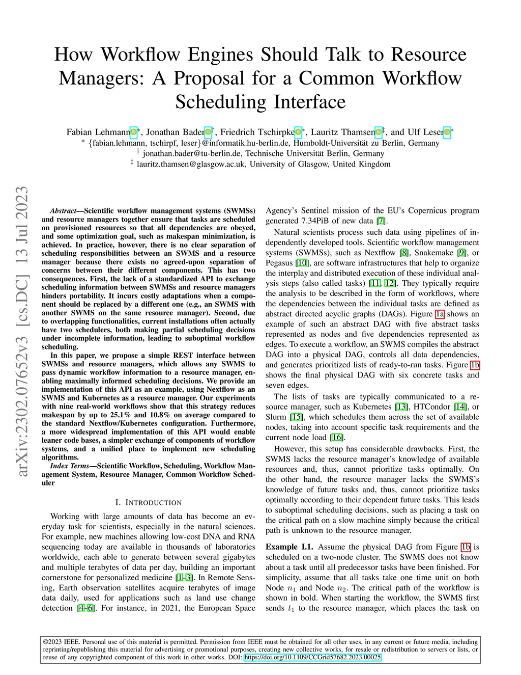 Scientific workflow management systems (SWMSs) and resource managers together ensure that tasks are scheduled on provisioned resources so that all dependencies are obeyed, and some optimization goal, such as makespan minimization, is achieved. In practice, however, there is no clear separation of scheduling responsibilities between an SWMS and a resource manager because there exists no agreed-upon separation of concerns between their different components. This has two consequences. First, the lack of a standardized API to exchange scheduling information between SWMSs and resource managers hinders portability. It incurs costly adaptations when a component should be replaced by a different one (e.g., an SWMS with another SWMS on the same resource manager). Second, due to overlapping functionalities, current installations often actually have two schedulers, both making partial scheduling decisions under incomplete information, leading to suboptimal workflow scheduling. In this paper, we propose a simple REST interface between SWMSs and resource managers, which allows any SWMS to pass dynamic workflow information to a resource manager, enabling maximally informed scheduling decisions. We provide an implementation of this API as an example, using Nextflow as an SWMS and Kubernetes as a resource manager. Our experiments with nine real-world workflows show that this strategy reduces makespan by up to 25.1% and 10.8% on average compared to the standard Nextflow/Kubernetes configuration. Furthermore, a more widespread implementation of this API would enable leaner code bases, a simpler exchange of components of workflow systems, and a unified place to implement new scheduling algorithms.