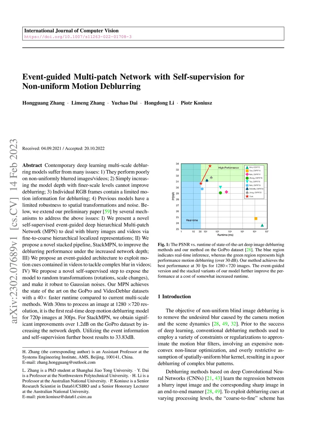 Contemporary deep learning multi-scale deblurring models suffer from many issues: 1) They perform poorly on non-uniformly blurred images/videos; 2) Simply increasing the model depth with finer-scale levels cannot improve deblurring; 3) Individual RGB frames contain a limited motion information for deblurring; 4) Previous models have a limited robustness to spatial transformations and noise. Below, we extend the DMPHN model by several mechanisms to address the above issues: I) We present a novel self-supervised event-guided deep hierarchical Multi-patch Network (MPN) to deal with blurry images and videos via fine-to-coarse hierarchical localized representations; II) We propose a novel stacked pipeline, StackMPN, to improve the deblurring performance under the increased network depth; III) We propose an event-guided architecture to exploit motion cues contained in videos to tackle complex blur in videos; IV) We propose a novel self-supervised step to expose the model to random transformations (rotations, scale changes), and make it robust to Gaussian noises. Our MPN achieves the state of the art on the GoPro and VideoDeblur datasets with a 40x faster runtime compared to current multi-scale methods. With 30ms to process an image at 1280x720 resolution, it is the first real-time deep motion deblurring model for 720p images at 30fps. For StackMPN, we obtain significant improvements over 1.2dB on the GoPro dataset by increasing the network depth. Utilizing the event information and self-supervision further boost results to 33.83dB.