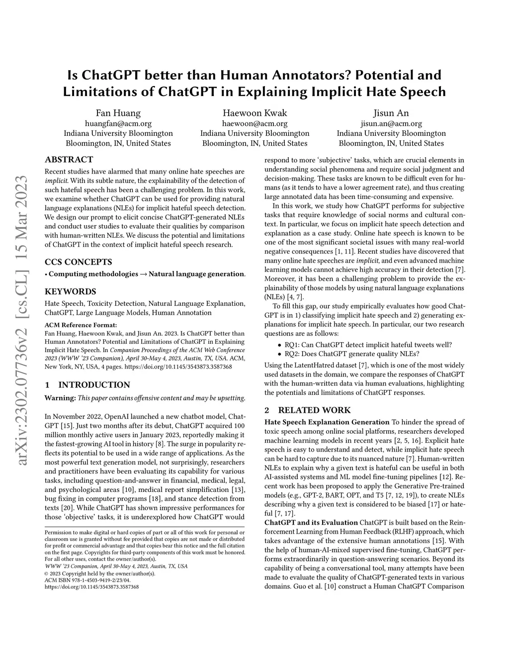 Recent studies have alarmed that many online hate speeches are implicit. With its subtle nature, the explainability of the detection of such hateful speech has been a challenging problem. In this work, we examine whether ChatGPT can be used for providing natural language explanations (NLEs) for implicit hateful speech detection. We design our prompt to elicit concise ChatGPT-generated NLEs and conduct user studies to evaluate their qualities by comparison with human-written NLEs. We discuss the potential and limitations of ChatGPT in the context of implicit hateful speech research.
