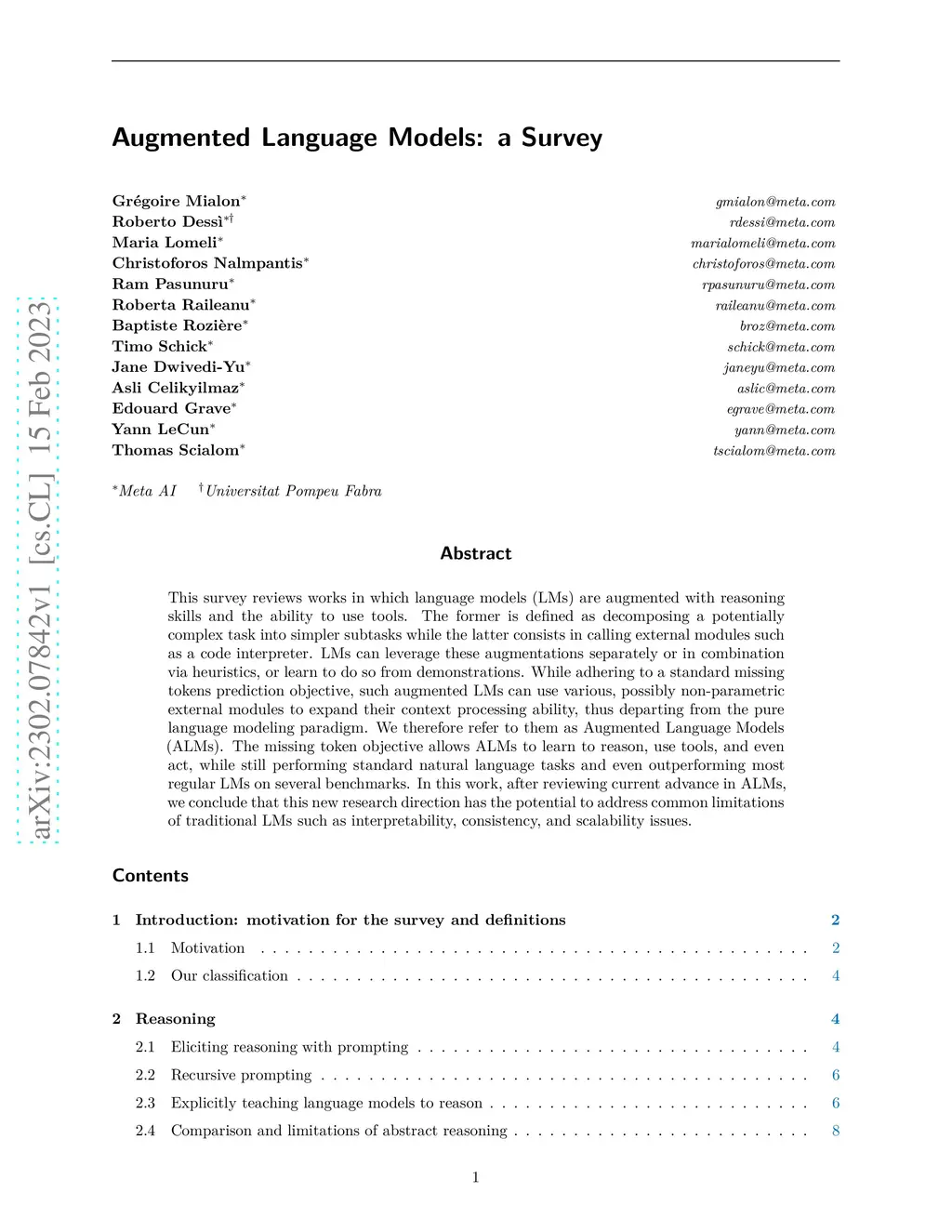 This survey reviews works in which language models (LMs) are augmented with reasoning skills and the ability to use tools. The former is defined as decomposing a potentially complex task into simpler subtasks while the latter consists in calling external modules such as a code interpreter. LMs can leverage these augmentations separately or in combination via heuristics, or learn to do so from demonstrations. While adhering to a standard missing tokens prediction objective, such augmented LMs can use various, possibly non-parametric external modules to expand their context processing ability, thus departing from the pure language modeling paradigm. We therefore refer to them as Augmented Language Models (ALMs). The missing token objective allows ALMs to learn to reason, use tools, and even act, while still performing standard natural language tasks and even outperforming most regular LMs on several benchmarks. In this work, after reviewing current advance in ALMs, we conclude that this new research direction has the potential to address common limitations of traditional LMs such as interpretability, consistency, and scalability issues.