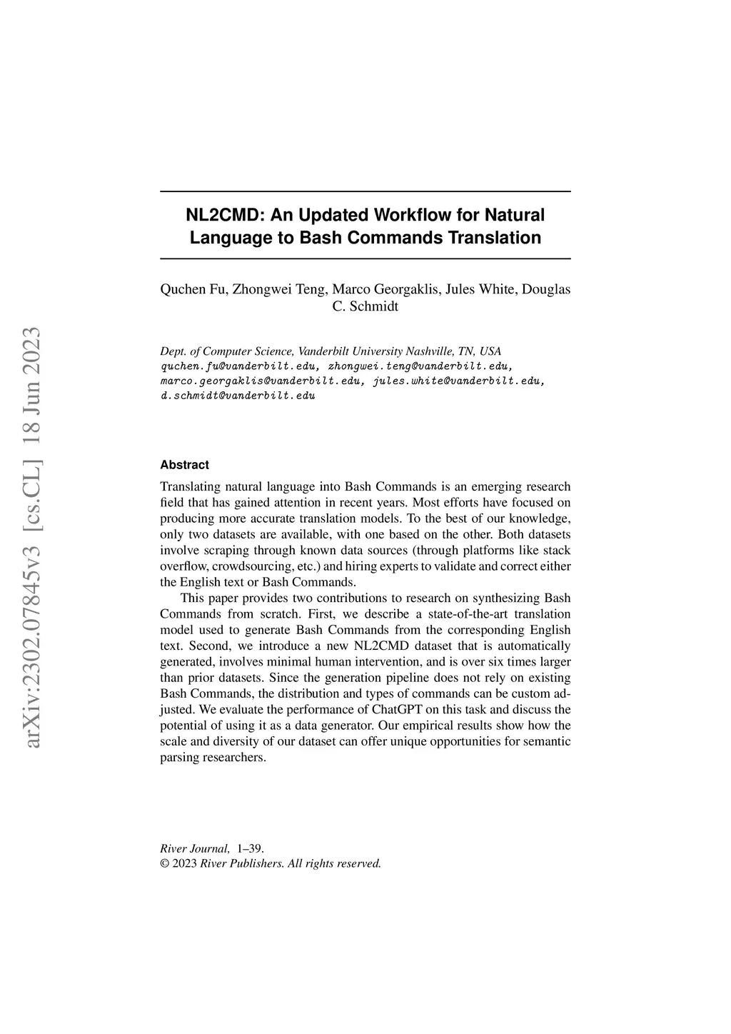 Translating natural language into Bash Commands is an emerging research field that has gained attention in recent years. Most efforts have focused on producing more accurate translation models. To the best of our knowledge, only two datasets are available, with one based on the other. Both datasets involve scraping through known data sources (through platforms like stack overflow, crowdsourcing, etc.) and hiring experts to validate and correct either the English text or Bash Commands. This paper provides two contributions to research on synthesizing Bash Commands from scratch. First, we describe a state-of-the-art translation model used to generate Bash Commands from the corresponding English text. Second, we introduce a new NL2CMD dataset that is automatically generated, involves minimal human intervention, and is over six times larger than prior datasets. Since the generation pipeline does not rely on existing Bash Commands, the distribution and types of commands can be custom adjusted. We evaluate the performance of ChatGPT on this task and discuss the potential of using it as a data generator. Our empirical results show how the scale and diversity of our dataset can offer unique opportunities for semantic parsing researchers.