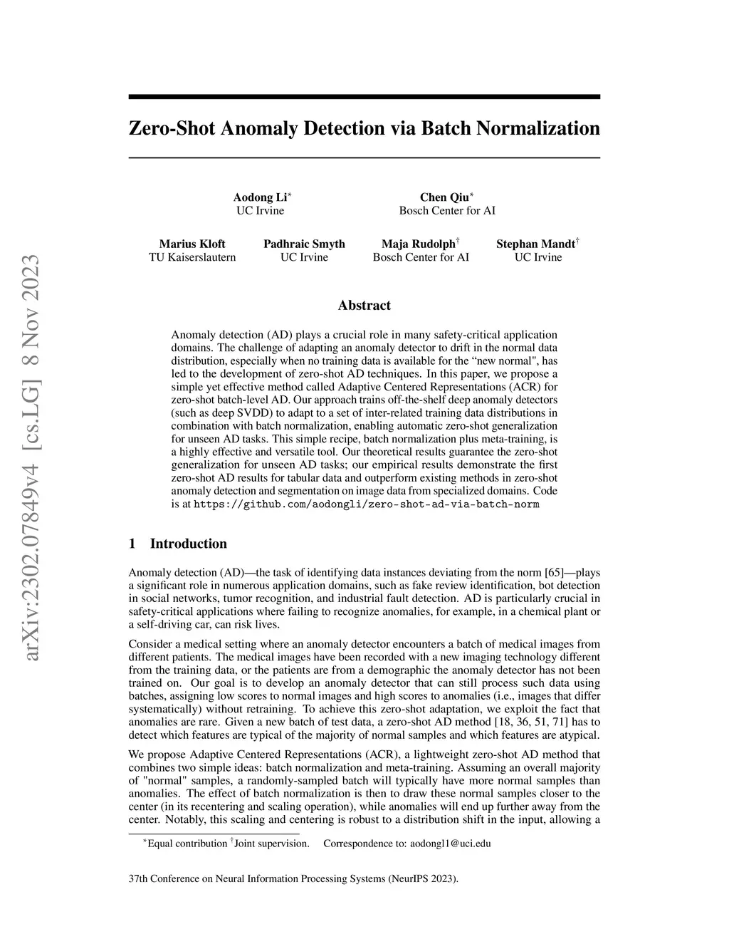 Anomaly detection (AD) plays a crucial role in many safety-critical application domains. The challenge of adapting an anomaly detector to drift in the normal data distribution, especially when no training data is available for the "new normal", has led to the development of zero-shot AD techniques. In this paper, we propose a simple yet effective method called Adaptive Centered Representations (ACR) for zero-shot batch-level AD. Our approach trains off-the-shelf deep anomaly detectors (such as deep SVDD) to adapt to a set of inter-related training data distributions in combination with batch normalization, enabling automatic zero-shot generalization for unseen AD tasks. This simple recipe, batch normalization plus meta-training, is a highly effective and versatile tool. Our results demonstrate the first zero-shot AD results for tabular data and outperform existing methods in zero-shot anomaly detection and segmentation on image data from specialized domains.