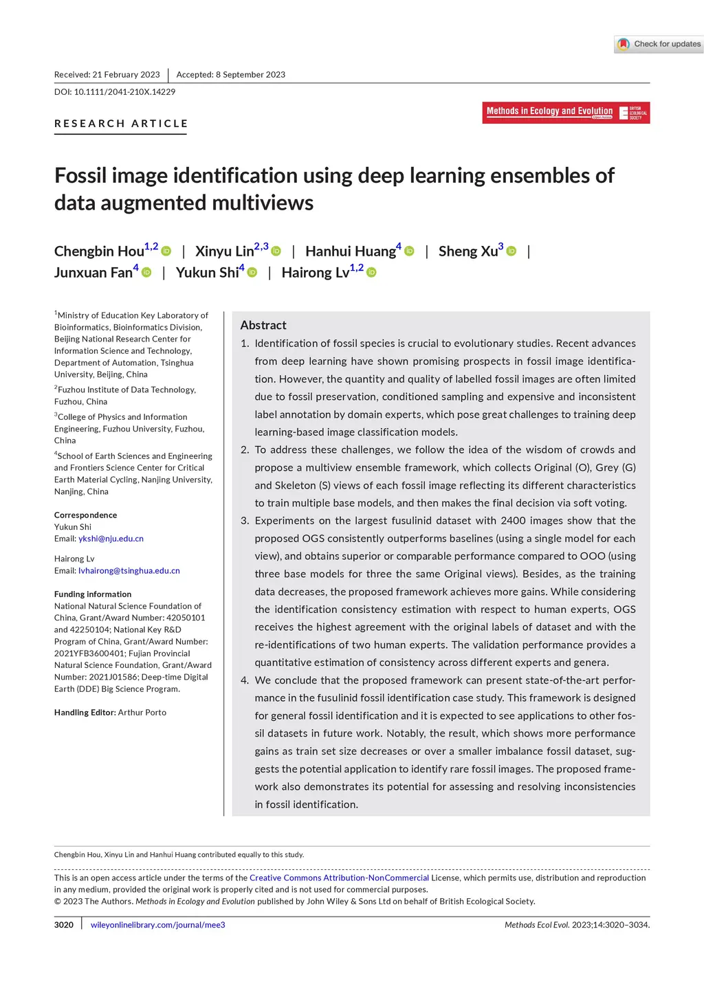 Identification of fossil species is crucial to evolutionary studies. Recent advances from deep learning have shown promising prospects in fossil image identification. However, the quantity and quality of labeled fossil images are often limited due to fossil preservation, conditioned sampling, and expensive and inconsistent label annotation by domain experts, which pose great challenges to training deep learning based image classification models. To address these challenges, we follow the idea of the wisdom of crowds and propose a multiview ensemble framework, which collects Original (O), Gray (G), and Skeleton (S) views of each fossil image reflecting its different characteristics to train multiple base models, and then makes the final decision via soft voting. Experiments on the largest fusulinid dataset with 2400 images show that the proposed OGS consistently outperforms baselines (using a single model for each view), and obtains superior or comparable performance compared to OOO (using three base models for three the same Original views). Besides, as the training data decreases, the proposed framework achieves more gains. While considering the identification consistency estimation with respect to human experts, OGS receives the highest agreement with the original labels of dataset and with the re-identifications of two human experts. The validation performance provides a quantitative estimation of consistency across different experts and genera. We conclude that the proposed framework can present state-of-the-art performance in the fusulinid fossil identification case study. This framework is designed for general fossil identification and it is expected to see applications to other fossil datasets in future work. The source code is publicly available at https://github.com/houchengbin/Fossil-Image-Identification to benefit future research in fossil image identification.