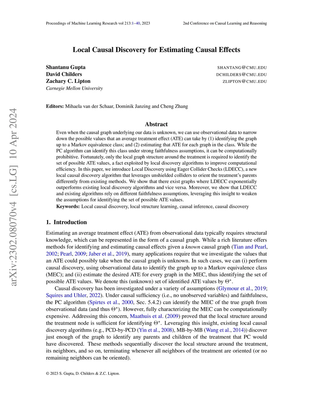 Even when the causal graph underlying our data is unknown, we can use observational data to narrow down the possible values that an average treatment effect (ATE) can take by (1) identifying the graph up to a Markov equivalence class; and (2) estimating that ATE for each graph in the class. While the PC algorithm can identify this class under strong faithfulness assumptions, it can be computationally prohibitive. Fortunately, only the local graph structure around the treatment is required to identify the set of possible ATE values, a fact exploited by local discovery algorithms to improve computational efficiency. In this paper, we introduce Local Discovery using Eager Collider Checks (LDECC), a new local causal discovery algorithm that leverages unshielded colliders to orient the treatment's parents differently from existing methods. We show that there exist graphs where LDECC exponentially outperforms existing local discovery algorithms and vice versa. Moreover, we show that LDECC and existing algorithms rely on different faithfulness assumptions, leveraging this insight to weaken the assumptions for identifying the set of possible ATE values.