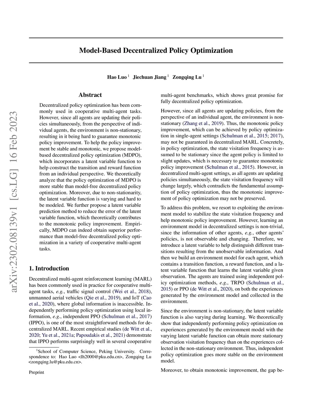 Decentralized policy optimization has been commonly used in cooperative multi-agent tasks. However, since all agents are updating their policies simultaneously, from the perspective of individual agents, the environment is non-stationary, resulting in it being hard to guarantee monotonic policy improvement. To help the policy improvement be stable and monotonic, we propose model-based decentralized policy optimization (MDPO), which incorporates a latent variable function to help construct the transition and reward function from an individual perspective. We theoretically analyze that the policy optimization of MDPO is more stable than model-free decentralized policy optimization. Moreover, due to non-stationarity, the latent variable function is varying and hard to be modeled. We further propose a latent variable prediction method to reduce the error of the latent variable function, which theoretically contributes to the monotonic policy improvement. Empirically, MDPO can indeed obtain superior performance than model-free decentralized policy optimization in a variety of cooperative multi-agent tasks.