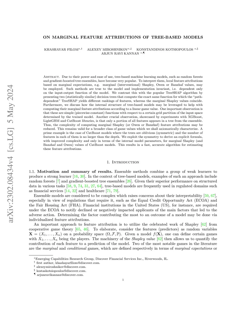 Due to their power and ease of use, tree-based machine learning models, such as random forests and gradient-boosted tree ensembles, have become very popular. To interpret them, local feature attributions based on marginal expectations, e.g. marginal (interventional) Shapley, Owen or Banzhaf values, may be employed. Such methods are true to the model and implementation invariant, i.e. dependent only on the input-output function of the model. We contrast this with the popular TreeSHAP algorithm by presenting two (statistically similar) decision trees that compute the exact same function for which the "path-dependent" TreeSHAP yields different rankings of features, whereas the marginal Shapley values coincide. Furthermore, we discuss how the internal structure of tree-based models may be leveraged to help with computing their marginal feature attributions according to a linear game value. One important observation is that these are simple (piecewise-constant) functions with respect to a certain grid partition of the input space determined by the trained model. Another crucial observation, showcased by experiments with XGBoost, LightGBM and CatBoost libraries, is that only a portion of all features appears in a tree from the ensemble. Thus, the complexity of computing marginal Shapley (or Owen or Banzhaf) feature attributions may be reduced. This remains valid for a broader class of game values which we shall axiomatically characterize. A prime example is the case of CatBoost models where the trees are oblivious (symmetric) and the number of features in each of them is no larger than the depth. We exploit the symmetry to derive an explicit formula, with improved complexity and only in terms of the internal model parameters, for marginal Shapley (and Banzhaf and Owen) values of CatBoost models. This results in a fast, accurate algorithm for estimating these feature attributions.