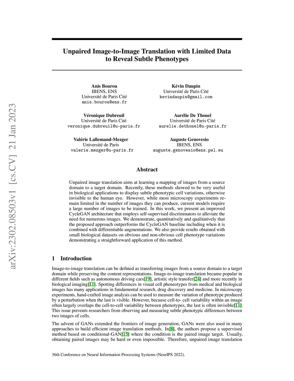Unpaired image-to-image translation methods aim at learning a mapping of images from a source domain to a target domain. Recently, these methods proved to be very useful in biological applications to display subtle phenotypic cell variations otherwise invisible to the human eye. However, current models require a large number of images to be trained, while mostmicroscopy experiments remain limited in the number of images they can produce. In this work, we present an improved CycleGAN architecture that employs self-supervised discriminators to alleviate the need for numerous images. We demonstrate quantitatively and qualitatively that the proposed approach outperforms the CycleGAN baseline, including when it is combined with differentiable augmentations. We also provide results obtained with small biological datasets on obvious and non-obvious cell phenotype variations, demonstrating a straightforward application of this method.