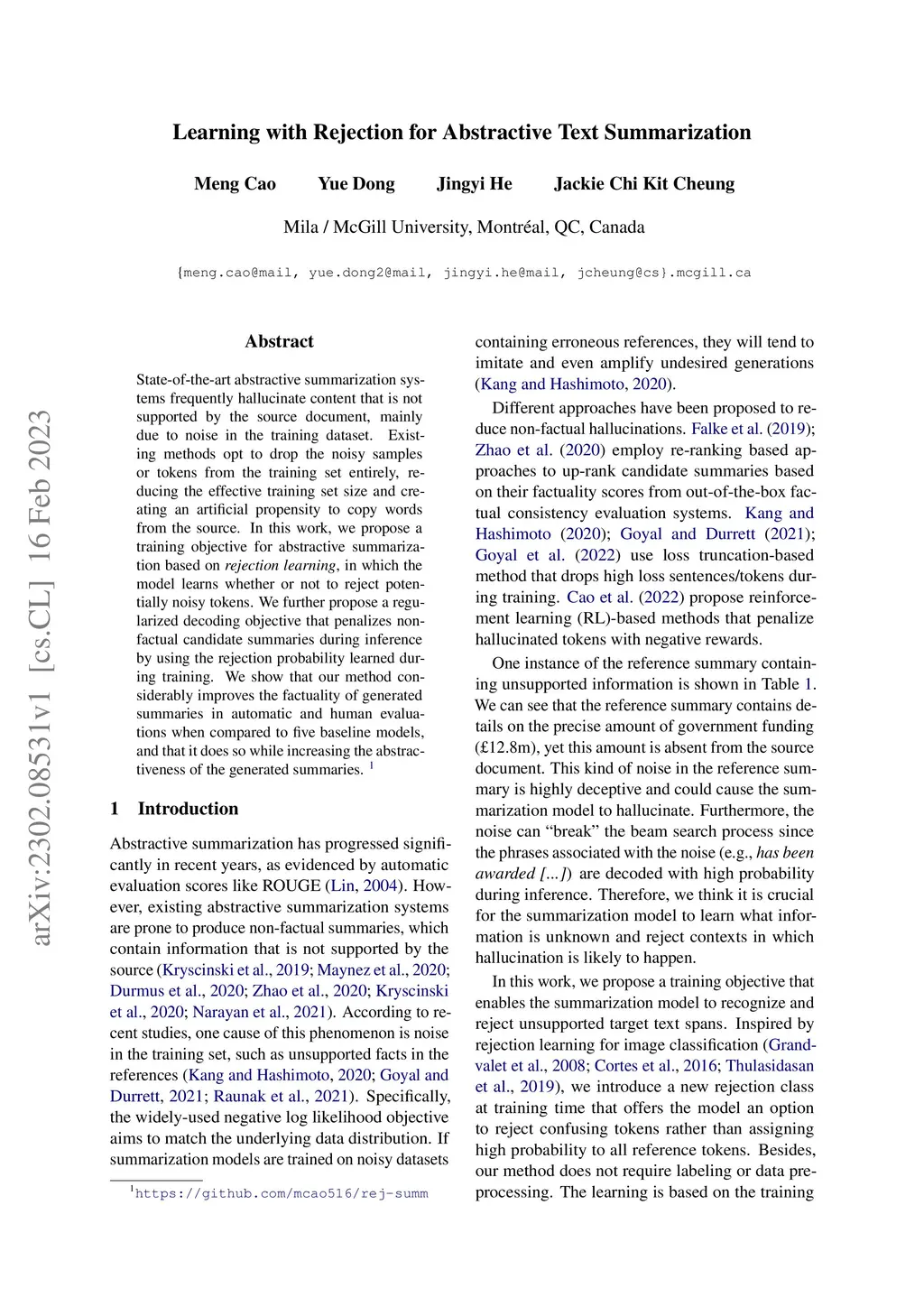 State-of-the-art abstractive summarization systems frequently hallucinate content that is not supported by the source document, mainly due to noise in the training dataset. Existing methods opt to drop the noisy samples or tokens from the training set entirely, reducing the effective training set size and creating an artificial propensity to copy words from the source. In this work, we propose a training objective for abstractive summarization based on rejection learning, in which the model learns whether or not to reject potentially noisy tokens. We further propose a regularized decoding objective that penalizes non-factual candidate summaries during inference by using the rejection probability learned during training. We show that our method considerably improves the factuality of generated summaries in automatic and human evaluations when compared to five baseline models and that it does so while increasing the abstractiveness of the generated summaries.