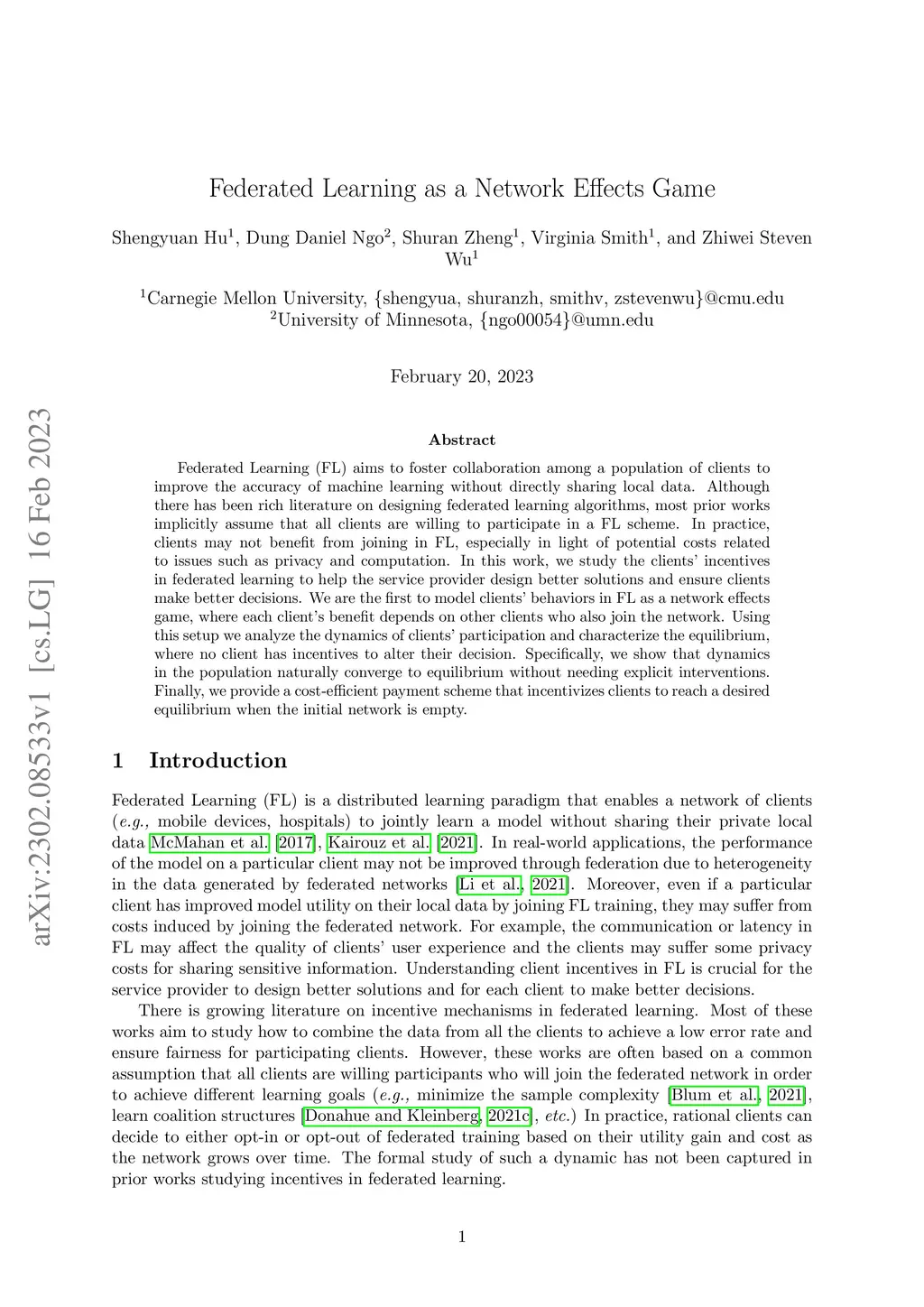 Federated Learning (FL) aims to foster collaboration among a population of clients to improve the accuracy of machine learning without directly sharing local data. Although there has been rich literature on designing federated learning algorithms, most prior works implicitly assume that all clients are willing to participate in a FL scheme. In practice, clients may not benefit from joining in FL, especially in light of potential costs related to issues such as privacy and computation. In this work, we study the clients' incentives in federated learning to help the service provider design better solutions and ensure clients make better decisions. We are the first to model clients' behaviors in FL as a network effects game, where each client's benefit depends on other clients who also join the network. Using this setup we analyze the dynamics of clients' participation and characterize the equilibrium, where no client has incentives to alter their decision. Specifically, we show that dynamics in the population naturally converge to equilibrium without needing explicit interventions. Finally, we provide a cost-efficient payment scheme that incentivizes clients to reach a desired equilibrium when the initial network is empty.
