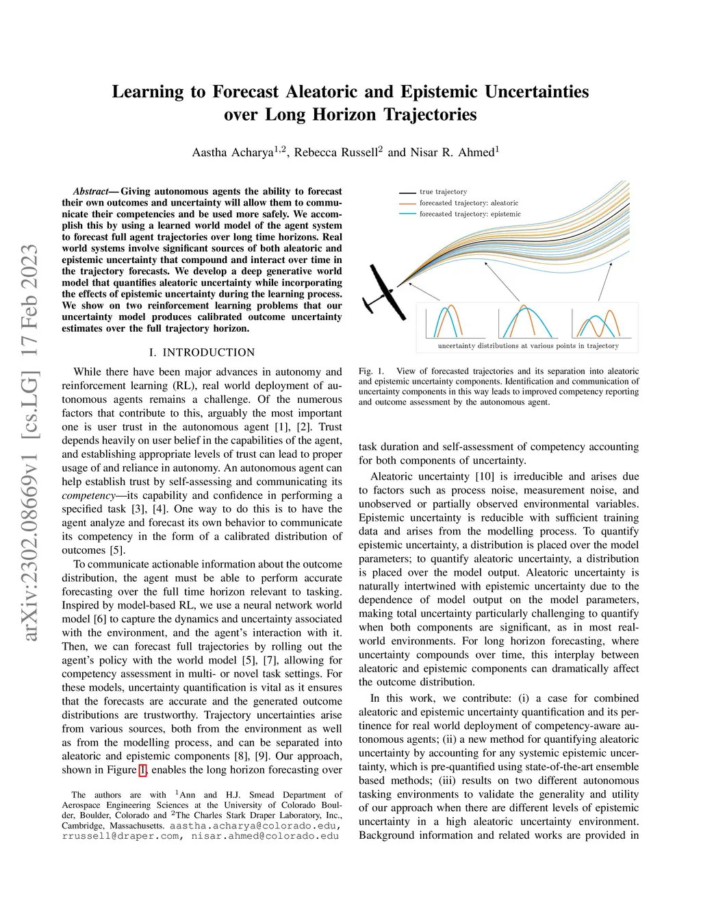 Giving autonomous agents the ability to forecast their own outcomes and uncertainty will allow them to communicate their competencies and be used more safely. We accomplish this by using a learned world model of the agent system to forecast full agent trajectories over long time horizons. Real world systems involve significant sources of both aleatoric and epistemic uncertainty that compound and interact over time in the trajectory forecasts. We develop a deep generative world model that quantifies aleatoric uncertainty while incorporating the effects of epistemic uncertainty during the learning process. We show on two reinforcement learning problems that our uncertainty model produces calibrated outcome uncertainty estimates over the full trajectory horizon.