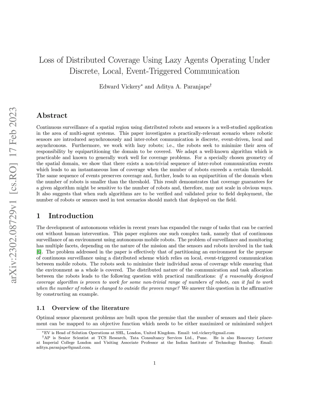 Continuous surveillance of a spatial region using distributed robots and sensors is a well-studied application in the area of multi-agent systems. This paper investigates a practically-relevant scenario where robotic sensors are introduced asynchronously and inter-robot communication is discrete, event-driven, local and asynchronous. Furthermore, we work with lazy robots; i.e., the robots seek to minimize their area of responsibility by equipartitioning the domain to be covered. We adapt a well-known algorithm which is practicable and known to generally work well for coverage problems. For a specially chosen geometry of the spatial domain, we show that there exists a non-trivial sequence of inter-robot communication events which leads to an instantaneous loss of coverage when the number of robots exceeds a certain threshold. The same sequence of events preserves coverage and, further, leads to an equipartition of the domain when the number of robots is smaller than the threshold. This result demonstrates that coverage guarantees for a given algorithm might be sensitive to the number of robots and, therefore, may not scale in obvious ways. It also suggests that when such algorithms are to be verified and validated prior to field deployment, the number of robots or sensors used in test scenarios should match that deployed on the field.