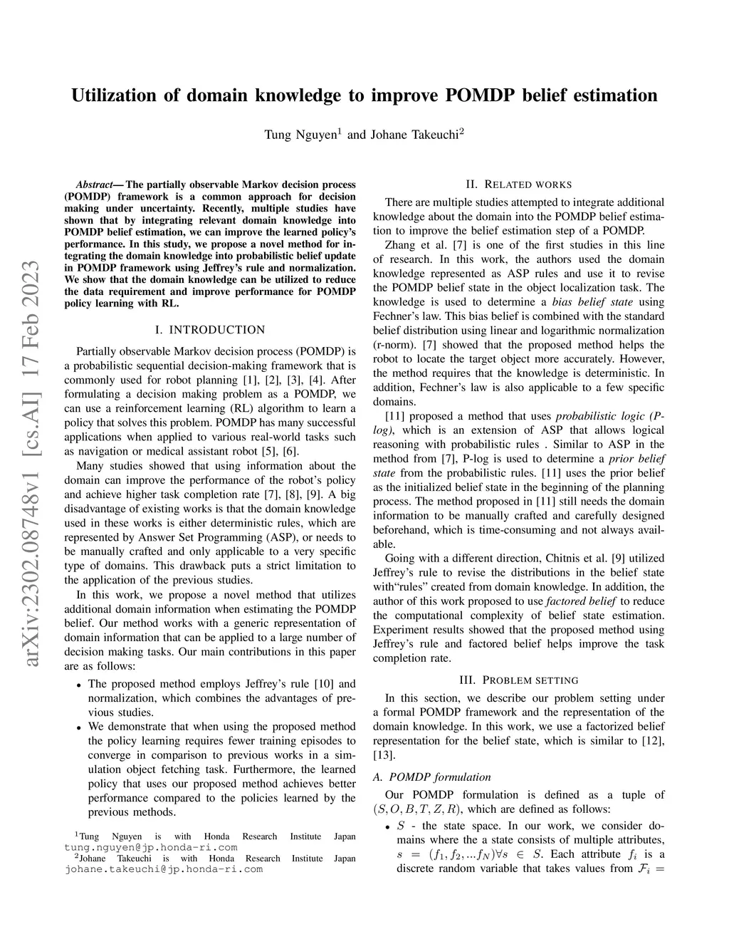 The partially observable Markov decision process (POMDP) framework is a common approach for decision making under uncertainty. Recently, multiple studies have shown that by integrating relevant domain knowledge into POMDP belief estimation, we can improve the learned policy's performance. In this study, we propose a novel method for integrating the domain knowledge into probabilistic belief update in POMDP framework using Jeffrey's rule and normalization. We show that the domain knowledge can be utilized to reduce the data requirement and improve performance for POMDP policy learning with RL.