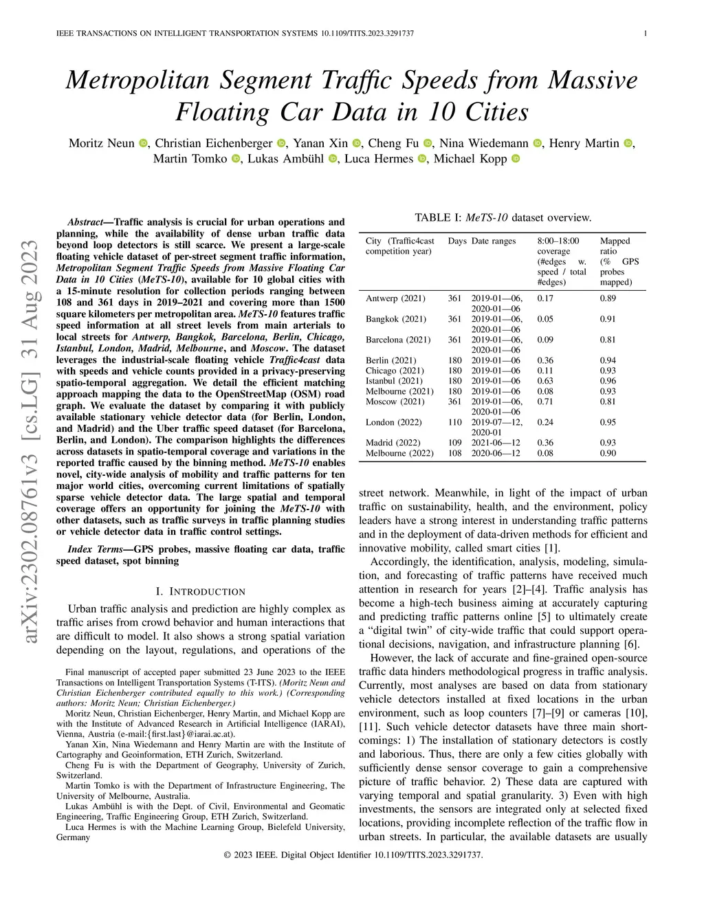 Traffic analysis is crucial for urban operations and planning, while the availability of dense urban traffic data beyond loop detectors is still scarce. We present a large-scale floating vehicle dataset of per-street segment traffic information, Metropolitan Segment Traffic Speeds from Massive Floating Car Data in 10 Cities (MeTS-10), available for 10 global cities with a 15-minute resolution for collection periods ranging between 108 and 361 days in 2019-2021 and covering more than 1500 square kilometers per metropolitan area. MeTS-10 features traffic speed information at all street levels from main arterials to local streets for Antwerp, Bangkok, Barcelona, Berlin, Chicago, Istanbul, London, Madrid, Melbourne and Moscow. The dataset leverages the industrial-scale floating vehicle Traffic4cast data with speeds and vehicle counts provided in a privacy-preserving spatio-temporal aggregation. We detail the efficient matching approach mapping the data to the OpenStreetMap road graph. We evaluate the dataset by comparing it with publicly available stationary vehicle detector data (for Berlin, London, and Madrid) and the Uber traffic speed dataset (for Barcelona, Berlin, and London). The comparison highlights the differences across datasets in spatio-temporal coverage and variations in the reported traffic caused by the binning method. MeTS-10 enables novel, city-wide analysis of mobility and traffic patterns for ten major world cities, overcoming current limitations of spatially sparse vehicle detector data. The large spatial and temporal coverage offers an opportunity for joining the MeTS-10 with other datasets, such as traffic surveys in traffic planning studies or vehicle detector data in traffic control settings.