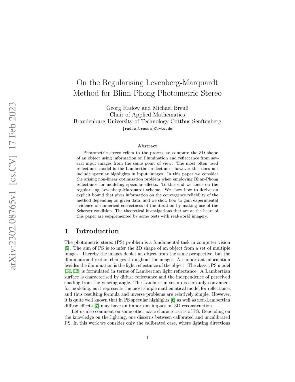 Photometric stereo refers to the process to compute the 3D shape of an object using information on illumination and reflectance from several input images from the same point of view. The most often used reflectance model is the Lambertian reflectance, however this does not include specular highlights in input images. In this paper we consider the arising non-linear optimisation problem when employing Blinn-Phong reflectance for modeling specular effects. To this end we focus on the regularising Levenberg-Marquardt scheme. We show how to derive an explicit bound that gives information on the convergence reliability of the method depending on given data, and we show how to gain experimental evidence of numerical correctness of the iteration by making use of the Scherzer condition. The theoretical investigations that are at the heart of this paper are supplemented by some tests with real-world imagery.