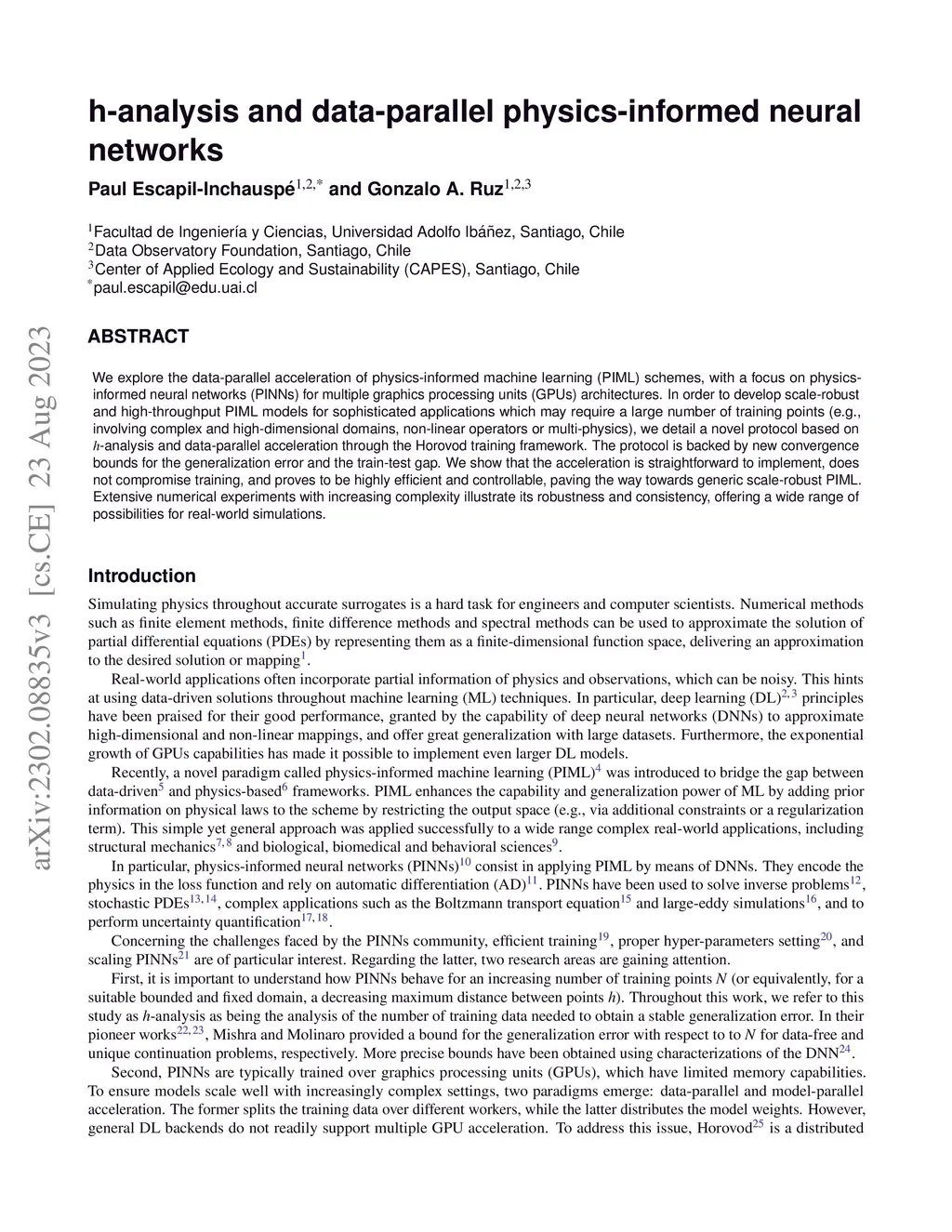We explore the data-parallel acceleration of physics-informed machine learning (PIML) schemes, with a focus on physics-informed neural networks (PINNs) for multiple graphics processing units (GPUs) architectures. In order to develop scale-robust and high-throughput PIML models for sophisticated applications which may require a large number of training points (e.g., involving complex and high-dimensional domains, non-linear operators or multi-physics), we detail a novel protocol based on -analysis and data-parallel acceleration through the Horovod training framework. The protocol is backed by new convergence bounds for the generalization error and the train-test gap. We show that the acceleration is straightforward to implement, does not compromise training, and proves to be highly efficient and controllable, paving the way towards generic scale-robust PIML. Extensive numerical experiments with increasing complexity illustrate its robustness and consistency, offering a wide range of possibilities for real-world simulations.