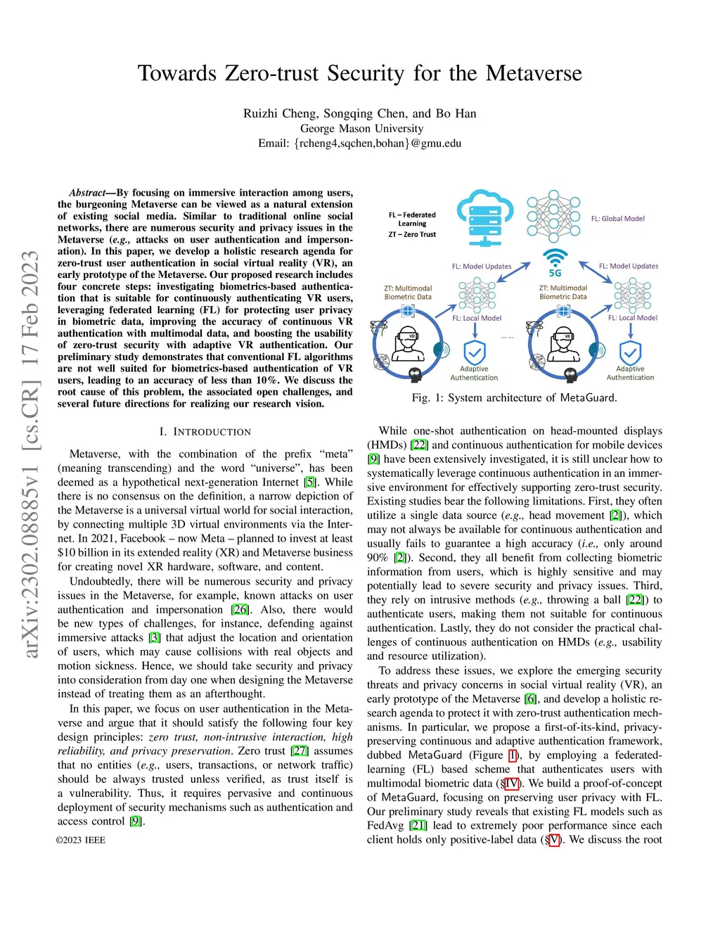 By focusing on immersive interaction among users, the burgeoning Metaverse can be viewed as a natural extension of existing social media. Similar to traditional online social networks, there are numerous security and privacy issues in the Metaverse (e.g., attacks on user authentication and impersonation). In this paper, we develop a holistic research agenda for zero-trust user authentication in social virtual reality (VR), an early prototype of the Metaverse. Our proposed research includes four concrete steps: investigating biometrics-based authentication that is suitable for continuously authenticating VR users, leveraging federated learning (FL) for protecting user privacy in biometric data, improving the accuracy of continuous VR authentication with multimodal data, and boosting the usability of zero-trust security with adaptive VR authentication. Our preliminary study demonstrates that conventional FL algorithms are not well suited for biometrics-based authentication of VR users, leading to an accuracy of less than 10%. We discuss the root cause of this problem, the associated open challenges, and several future directions for realizing our research vision.