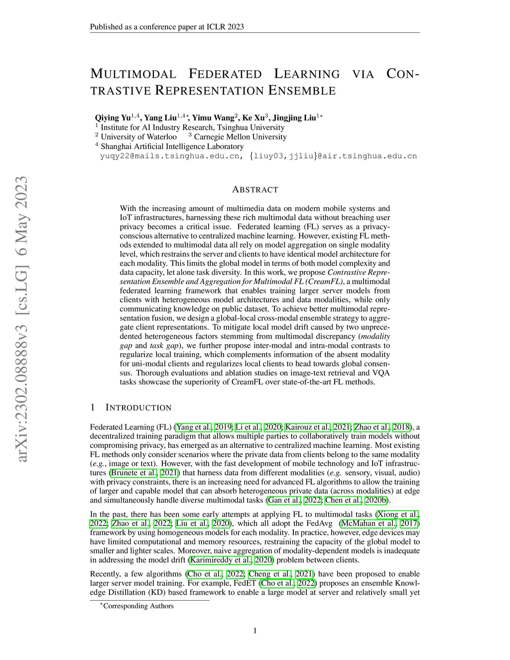 With the increasing amount of multimedia data on modern mobile systems and IoT infrastructures, harnessing these rich multimodal data without breaching user privacy becomes a critical issue. Federated learning (FL) serves as a privacy-conscious alternative to centralized machine learning. However, existing FL methods extended to multimodal data all rely on model aggregation on single modality level, which restrains the server and clients to have identical model architecture for each modality. This limits the global model in terms of both model complexity and data capacity, not to mention task diversity. In this work, we propose Contrastive Representation Ensemble and Aggregation for Multimodal FL (CreamFL), a multimodal federated learning framework that enables training larger server models from clients with heterogeneous model architectures and data modalities, while only communicating knowledge on public dataset. To achieve better multimodal representation fusion, we design a global-local cross-modal ensemble strategy to aggregate client representations. To mitigate local model drift caused by two unprecedented heterogeneous factors stemming from multimodal discrepancy (modality gap and task gap), we further propose two inter-modal and intra-modal contrasts to regularize local training, which complements information of the absent modality for uni-modal clients and regularizes local clients to head towards global consensus. Thorough evaluations and ablation studies on image-text retrieval and visual question answering tasks showcase the superiority of CreamFL over state-of-the-art FL methods and its practical value.
