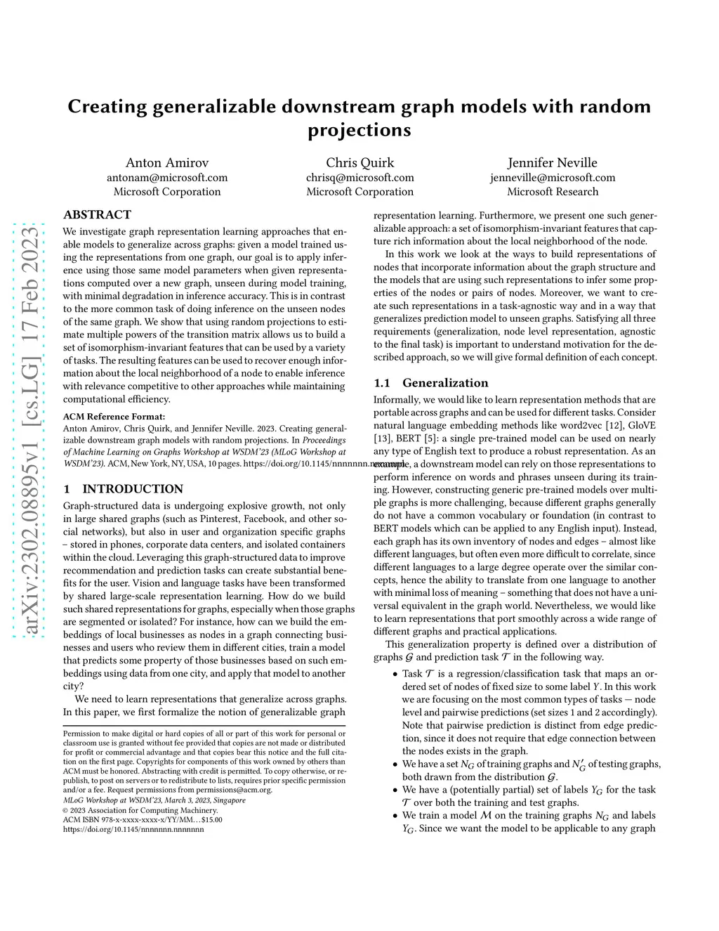 We investigate graph representation learning approaches that enable models to generalize across graphs: given a model trained using the representations from one graph, our goal is to apply inference using those same model parameters when given representations computed over a new graph, unseen during model training, with minimal degradation in inference accuracy. This is in contrast to the more common task of doing inference on the unseen nodes of the same graph. We show that using random projections to estimate multiple powers of the transition matrix allows us to build a set of isomorphism-invariant features that can be used by a variety of tasks. The resulting features can be used to recover enough information about the local neighborhood of a node to enable inference with relevance competitive to other approaches while maintaining computational efficiency.