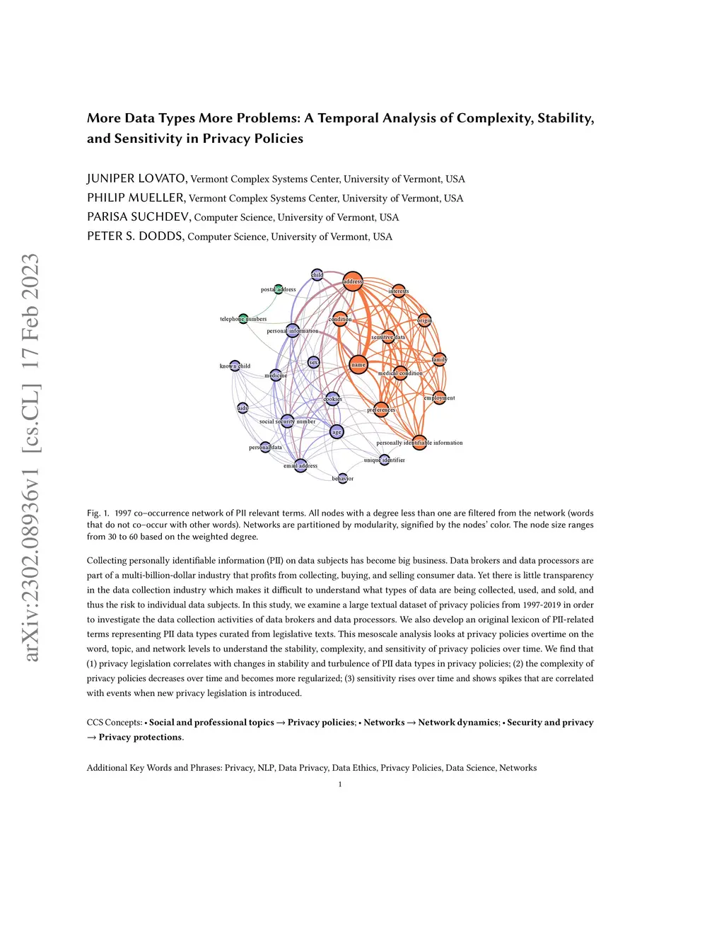 Collecting personally identifiable information (PII) on data subjects has become big business. Data brokers and data processors are part of a multi-billion-dollar industry that profits from collecting, buying, and selling consumer data. Yet there is little transparency in the data collection industry which makes it difficult to understand what types of data are being collected, used, and sold, and thus the risk to individual data subjects. In this study, we examine a large textual dataset of privacy policies from 1997-2019 in order to investigate the data collection activities of data brokers and data processors. We also develop an original lexicon of PII-related terms representing PII data types curated from legislative texts. This mesoscale analysis looks at privacy policies overtime on the word, topic, and network levels to understand the stability, complexity, and sensitivity of privacy policies over time. We find that (1) privacy legislation correlates with changes in stability and turbulence of PII data types in privacy policies; (2) the complexity of privacy policies decreases over time and becomes more regularized; (3) sensitivity rises over time and shows spikes that are correlated with events when new privacy legislation is introduced.