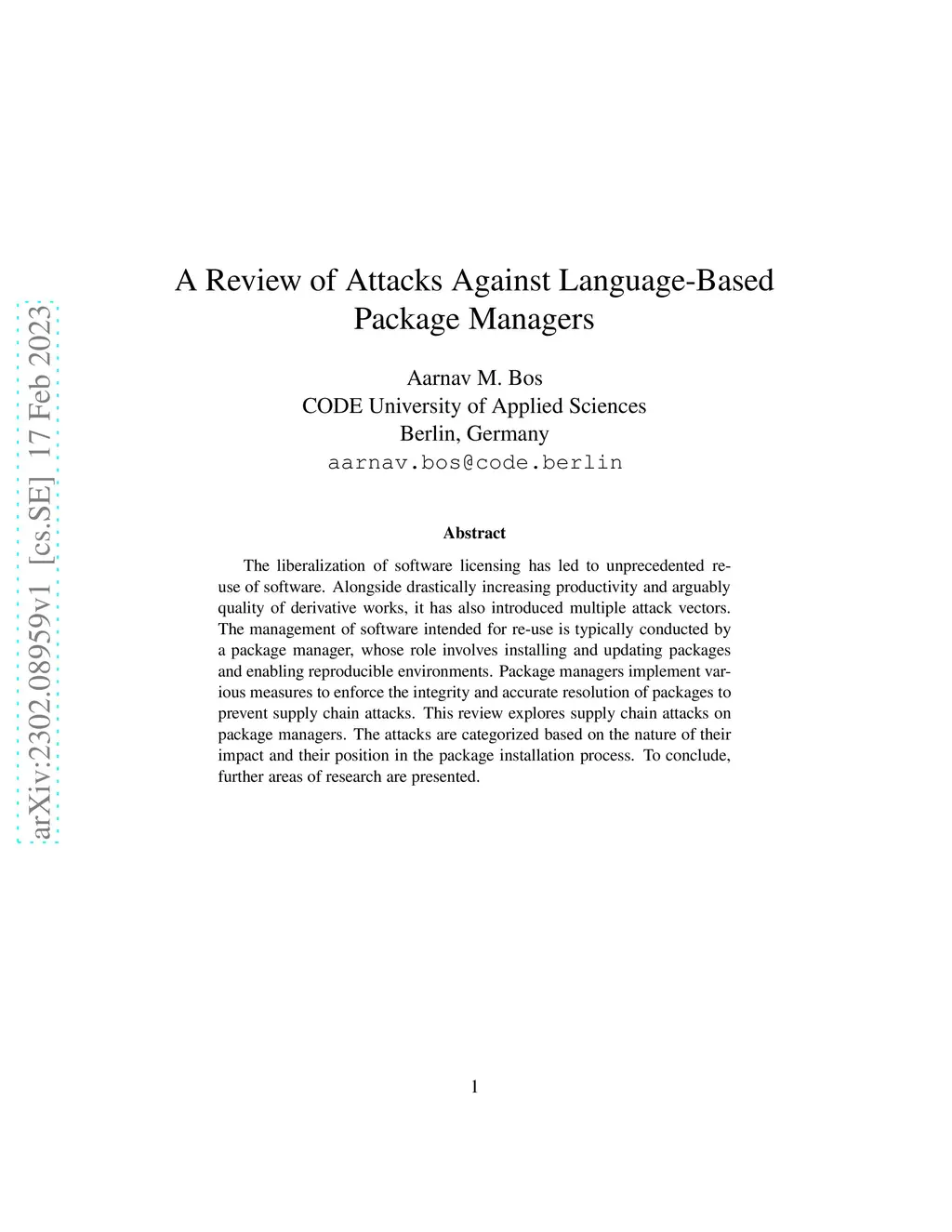 The liberalization of software licensing has led to unprecedented re-use of software. Alongside drastically increasing productivity and arguably quality of derivative works, it has also introduced multiple attack vectors. The management of software intended for re-use is typically conducted by a package manager, whose role involves installing and updating packages and enabling reproducible environments. Package managers implement various measures to enforce the integrity and accurate resolution of packages to prevent supply chain attacks. This review explores supply chain attacks on package managers. The attacks are categorized based on the nature of their impact and their position in the package installation process. To conclude, further areas of research are presented.