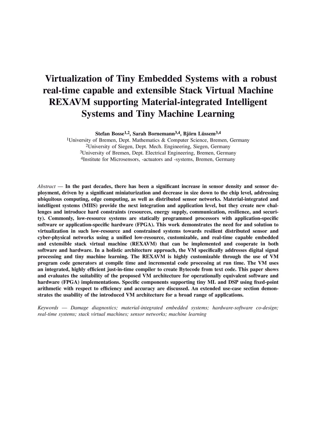 In the past decades, there has been a significant increase in sensor density and sensor deployment, driven by a significant miniaturization and decrease in size down to the chip level, addressing ubiquitous computing, edge computing, as well as distributed sensor networks. Material-integrated and intelligent systems (MIIS) provide the next integration and application level, but they create new challenges and introduce hard constraints (resources, energy supply, communication, resilience, and security). Commonly, low-resource systems are statically programmed processors with application-specific software or application-specific hardware (FPGA). This work demonstrates the need for and solution to virtualization in such low-resource and constrained systems towards resilient distributed sensor and cyber-physical networks using a unified low-resource, customizable, and real-time capable embedded and extensible stack virtual machine (REXAVM) that can be implemented and cooperate in both software and hardware. In a holistic architecture approach, the VM specifically addresses digital signal processing and tiny machine learning. The REXAVM is highly customizable through the use of VM program code generators at compile time and incremental code processing at run time. The VM uses an integrated, highly efficient just-in-time compiler to create Bytecode from text code. This paper shows and evaluates the suitability of the proposed VM architecture for operationally equivalent software and hardware (FPGA) implementations. Specific components supporting tiny ML and DSP using fixed-point arithmetic with respect to efficiency and accuracy are discussed. An extended use-case section demonstrates the usability of the introduced VM architecture for a broad range of applications.