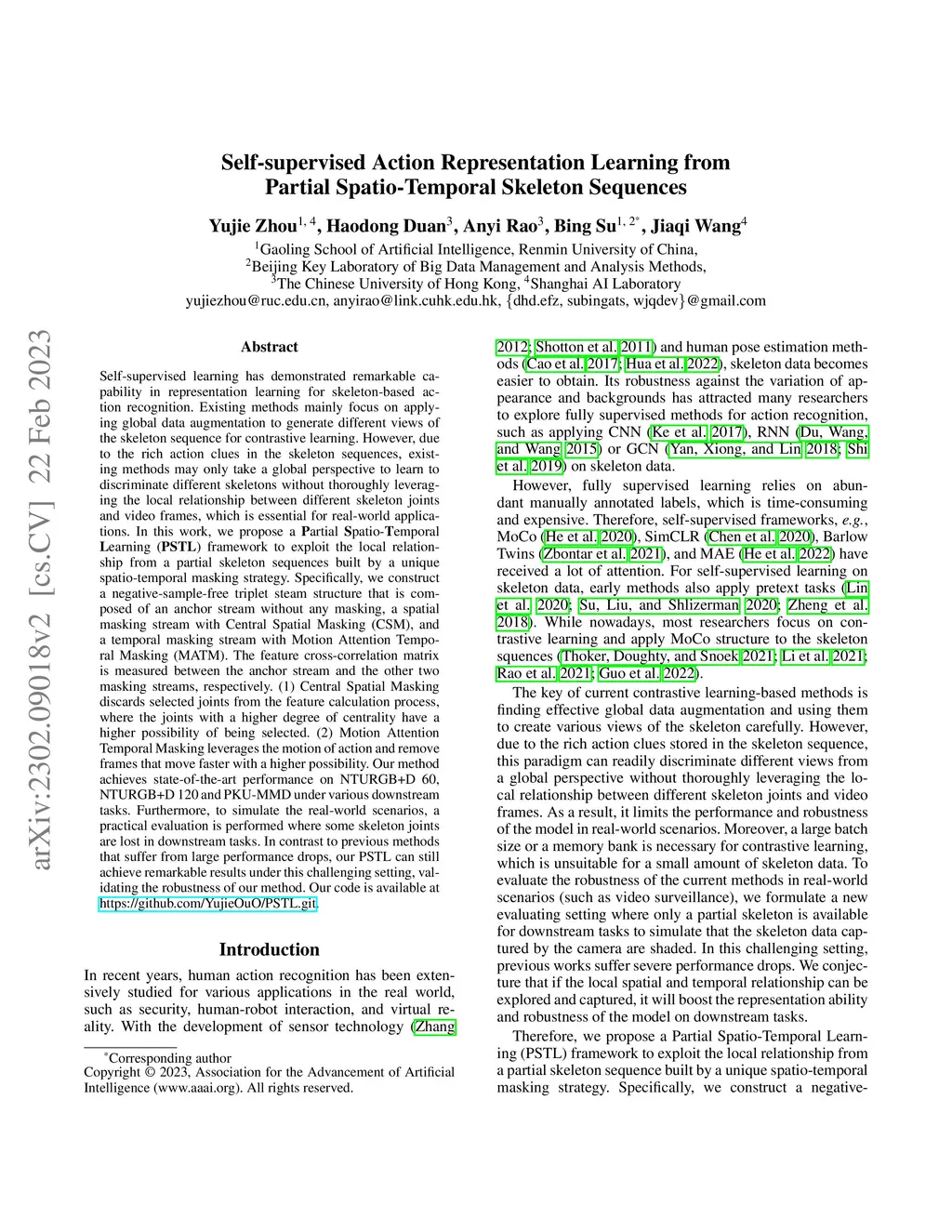 Self-supervised learning has demonstrated remarkable capability in representation learning for skeleton-based action recognition. Existing methods mainly focus on applying global data augmentation to generate different views of the skeleton sequence for contrastive learning. However, due to the rich action clues in the skeleton sequences, existing methods may only take a global perspective to learn to discriminate different skeletons without thoroughly leveraging the local relationship between different skeleton joints and video frames, which is essential for real-world applications. In this work, we propose a Partial Spatio-Temporal Learning (PSTL) framework to exploit the local relationship from a partial skeleton sequences built by a unique spatio-temporal masking strategy. Specifically, we construct a negative-sample-free triplet steam structure that is composed of an anchor stream without any masking, a spatial masking stream with Central Spatial Masking (CSM), and a temporal masking stream with Motion Attention Temporal Masking (MATM). The feature cross-correlation matrix is measured between the anchor stream and the other two masking streams, respectively. (1) Central Spatial Masking discards selected joints from the feature calculation process, where the joints with a higher degree of centrality have a higher possibility of being selected. (2) Motion Attention Temporal Masking leverages the motion of action and remove frames that move faster with a higher possibility. Our method achieves SOTA performance on NTU-60, NTU-120 and PKU-MMD under various downstream tasks. A practical evaluation is performed where some skeleton joints are lost in downstream tasks. In contrast to previous methods that suffer from large performance drops, our PSTL can still achieve remarkable results, validating the robustness of our method. Code: https://github.com/YujieOuO/PSTL.git.