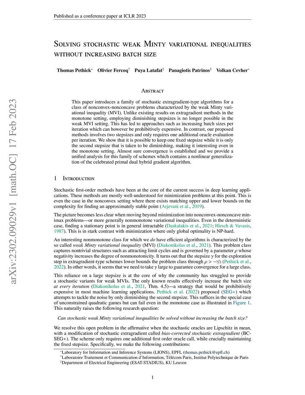 This paper introduces a family of stochastic extragradient-type algorithms for a class of nonconvex-nonconcave problems characterized by the weak Minty variational inequality (MVI). Unlike existing results on extragradient methods in the monotone setting, employing diminishing stepsizes is no longer possible in the weak MVI setting. This has led to approaches such as increasing batch sizes per iteration which can however be prohibitively expensive. In contrast, our proposed methods involves two stepsizes and only requires one additional oracle evaluation per iteration. We show that it is possible to keep one fixed stepsize while it is only the second stepsize that is taken to be diminishing, making it interesting even in the monotone setting. Almost sure convergence is established and we provide a unified analysis for this family of schemes which contains a nonlinear generalization of the celebrated primal dual hybrid gradient algorithm.