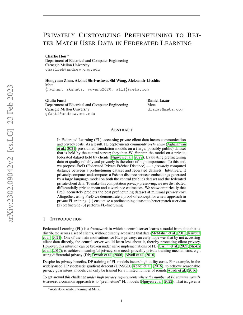 In Federated Learning (FL), accessing private client data incurs communication and privacy costs. As a result, FL deployments commonly prefinetune pretrained foundation models on a (large, possibly public) dataset that is held by the central server; they then FL-finetune the model on a private, federated dataset held by clients. Evaluating prefinetuning dataset quality reliably and privately is therefore of high importance. To this end, we propose FreD (Federated Private Fr\échet Distance) -- a privately computed distance between a prefinetuning dataset and federated datasets. Intuitively, it privately computes and compares a Fr\échet distance between embeddings generated by a large language model on both the central (public) dataset and the federated private client data. To make this computation privacy-preserving, we use distributed, differentially-private mean and covariance estimators. We show empirically that FreD accurately predicts the best prefinetuning dataset at minimal privacy cost. Altogether, using FreD we demonstrate a proof-of-concept for a new approach in private FL training: (1) customize a prefinetuning dataset to better match user data (2) prefinetune (3) perform FL-finetuning.