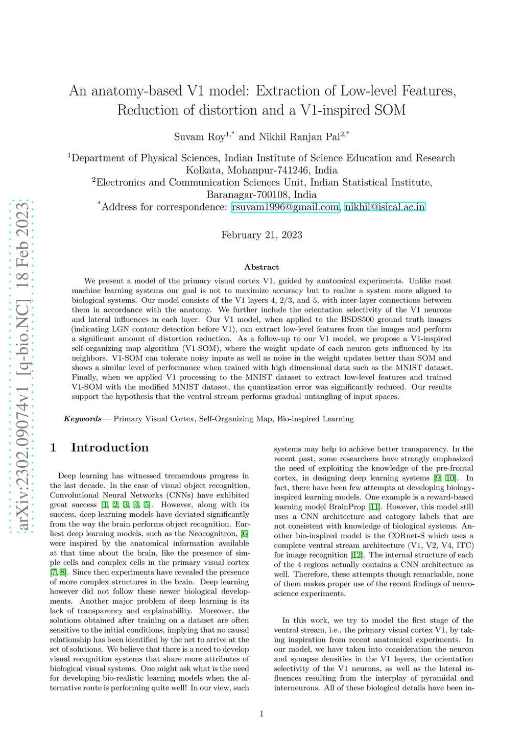 We present a model of the primary visual cortex V1, guided by anatomical experiments. Unlike most machine learning systems our goal is not to maximize accuracy but to realize a system more aligned to biological systems. Our model consists of the V1 layers 4, 2/3, and 5, with inter-layer connections between them in accordance with the anatomy. We further include the orientation selectivity of the V1 neurons and lateral influences in each layer. Our V1 model, when applied to the BSDS500 ground truth images (indicating LGN contour detection before V1), can extract low-level features from the images and perform a significant amount of distortion reduction. As a follow-up to our V1 model, we propose a V1-inspired self-organizing map algorithm (V1-SOM), where the weight update of each neuron gets influenced by its neighbors. V1-SOM can tolerate noisy inputs as well as noise in the weight updates better than SOM and shows a similar level of performance when trained with high dimensional data such as the MNIST dataset. Finally, when we applied V1 processing to the MNIST dataset to extract low-level features and trained V1-SOM with the modified MNIST dataset, the quantization error was significantly reduced. Our results support the hypothesis that the ventral stream performs gradual untangling of input spaces.