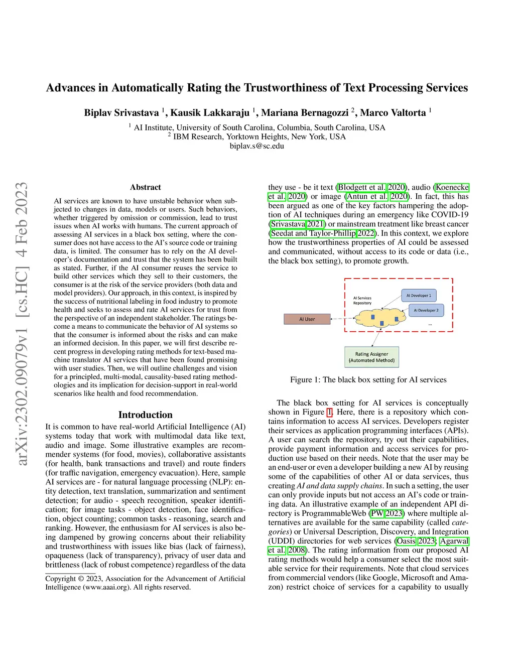 AI services are known to have unstable behavior when subjected to changes in data, models or users. Such behaviors, whether triggered by omission or commission, lead to trust issues when AI works with humans. The current approach of assessing AI services in a black box setting, where the consumer does not have access to the AI's source code or training data, is limited. The consumer has to rely on the AI developer's documentation and trust that the system has been built as stated. Further, if the AI consumer reuses the service to build other services which they sell to their customers, the consumer is at the risk of the service providers (both data and model providers). Our approach, in this context, is inspired by the success of nutritional labeling in food industry to promote health and seeks to assess and rate AI services for trust from the perspective of an independent stakeholder. The ratings become a means to communicate the behavior of AI systems so that the consumer is informed about the risks and can make an informed decision. In this paper, we will first describe recent progress in developing rating methods for text-based machine translator AI services that have been found promising with user studies. Then, we will outline challenges and vision for a principled, multi-modal, causality-based rating methodologies and its implication for decision-support in real-world scenarios like health and food recommendation.
