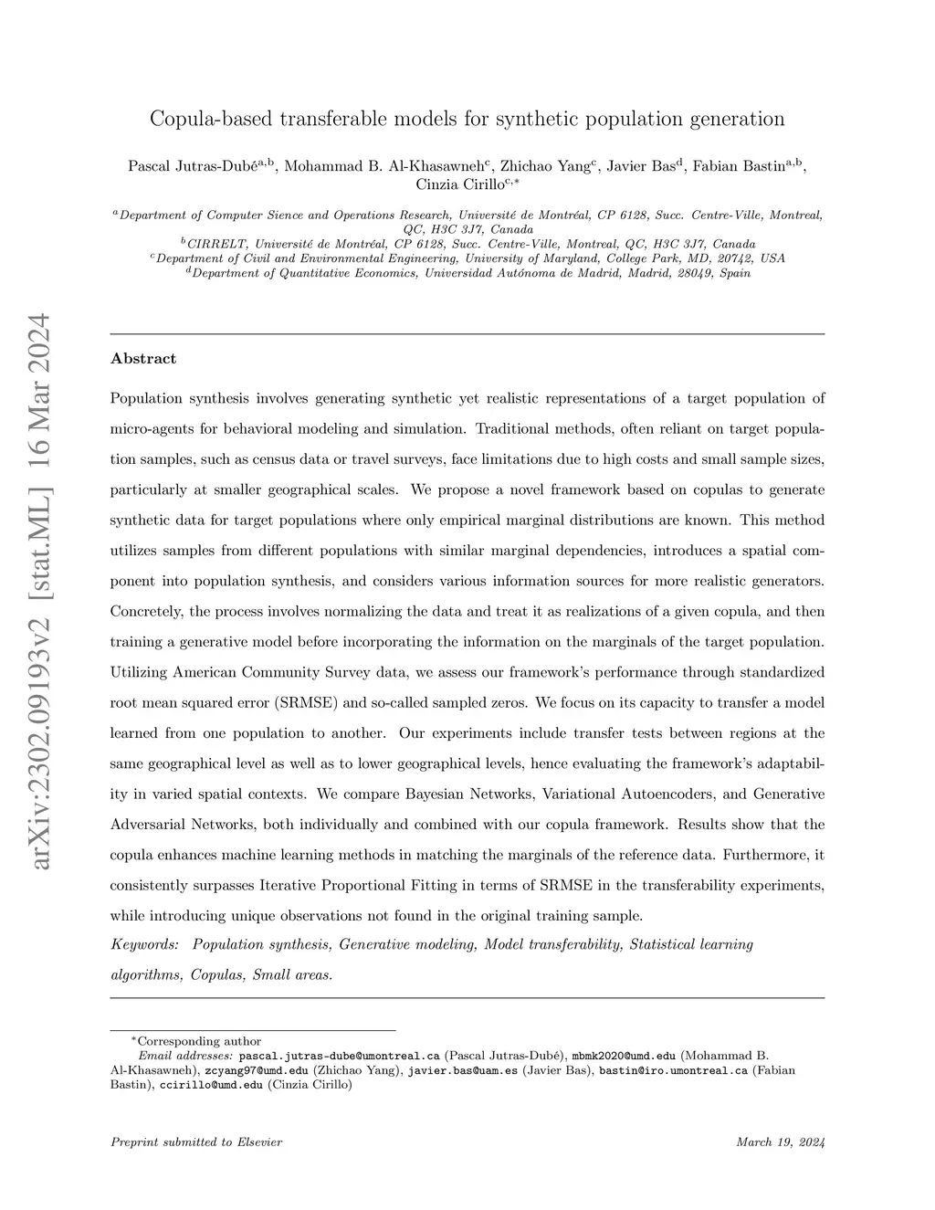Copula-based transferable models for synthetic population generation