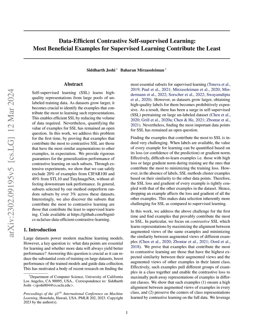 Self-supervised learning (SSL) learns high-quality representations from large pools of unlabeled training data. As datasets grow larger, it becomes crucial to identify the examples that contribute the most to learning such representations. This enables efficient SSL by reducing the volume of data required. Nevertheless, quantifying the value of examples for SSL has remained an open question. In this work, we address this problem for the first time, by proving that examples that contribute the most to contrastive SSL are those that have the most similar augmentations to other examples, in expectation. We provide rigorous guarantees for the generalization performance of contrastive learning on such subsets. Through extensive experiments, we show that we can safely exclude 20% of examples from CIFAR100 and 40% from STL10 and TinyImageNet, without affecting downstream task performance. In general, subsets selected by our method outperform random subsets by over 3% across these datasets. Interestingly, we also discover the subsets that contribute the most to contrastive learning are those that contribute the least to supervised learning. Code available at https://github.com/bigml-cs-ucla/sas-data-efficient-contrastive-learning.