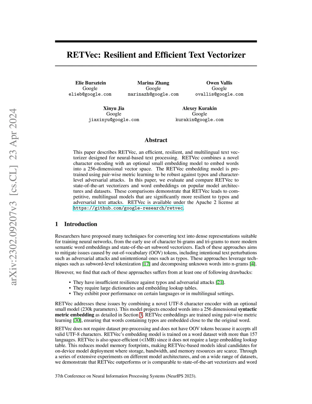 This paper describes RETVec, an efficient, resilient, and multilingual text vectorizer designed for neural-based text processing. RETVec combines a novel character encoding with an optional small embedding model to embed words into a 256-dimensional vector space. The RETVec embedding model is pre-trained using pair-wise metric learning to be robust against typos and character-level adversarial attacks. In this paper, we evaluate and compare RETVec to state-of-the-art vectorizers and word embeddings on popular model architectures and datasets. These comparisons demonstrate that RETVec leads to competitive, multilingual models that are significantly more resilient to typos and adversarial text attacks. RETVec is available under the Apache 2 license at https://github.com/google-research/retvec.
