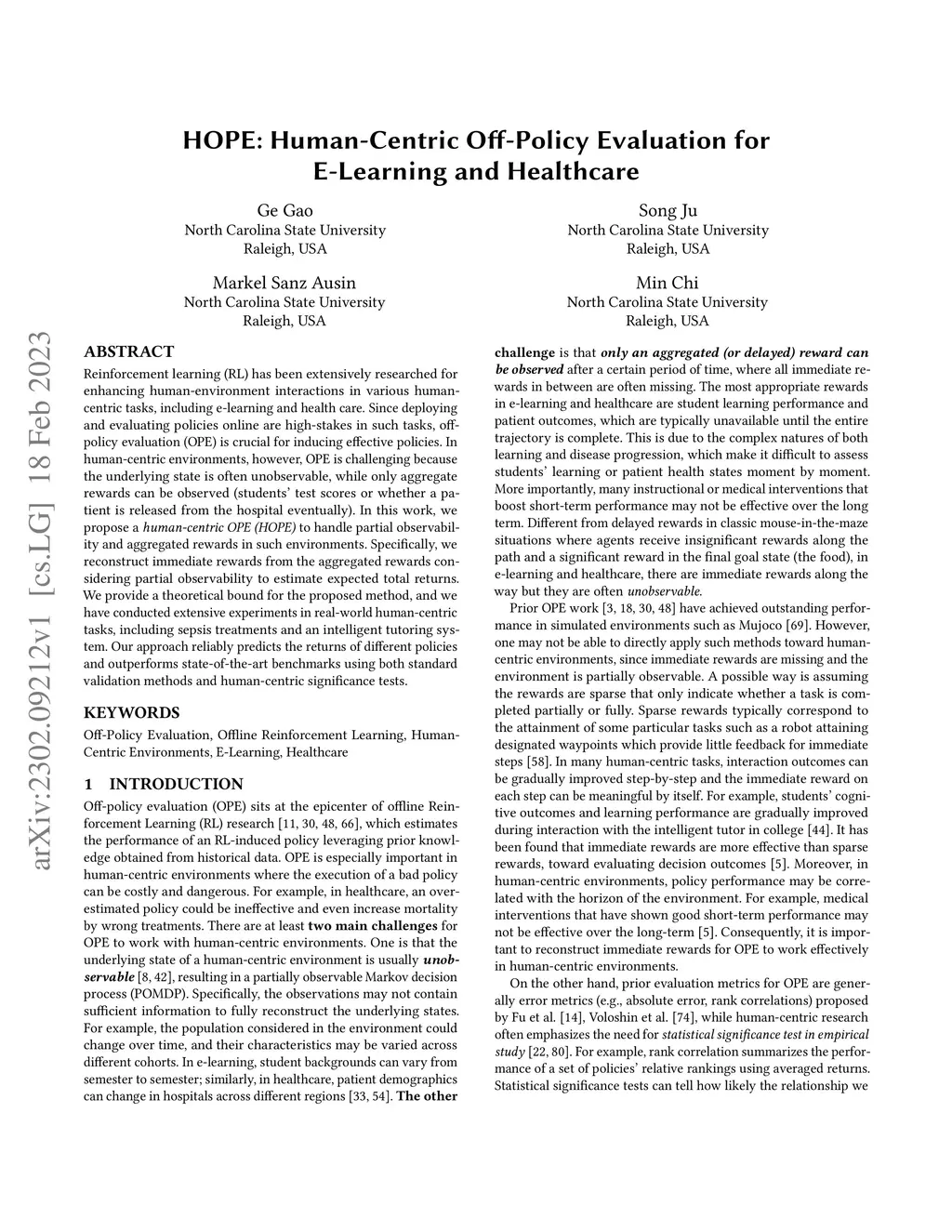 HOPE: Human-Centric Off-Policy Evaluation for E-Learning and Healthcare