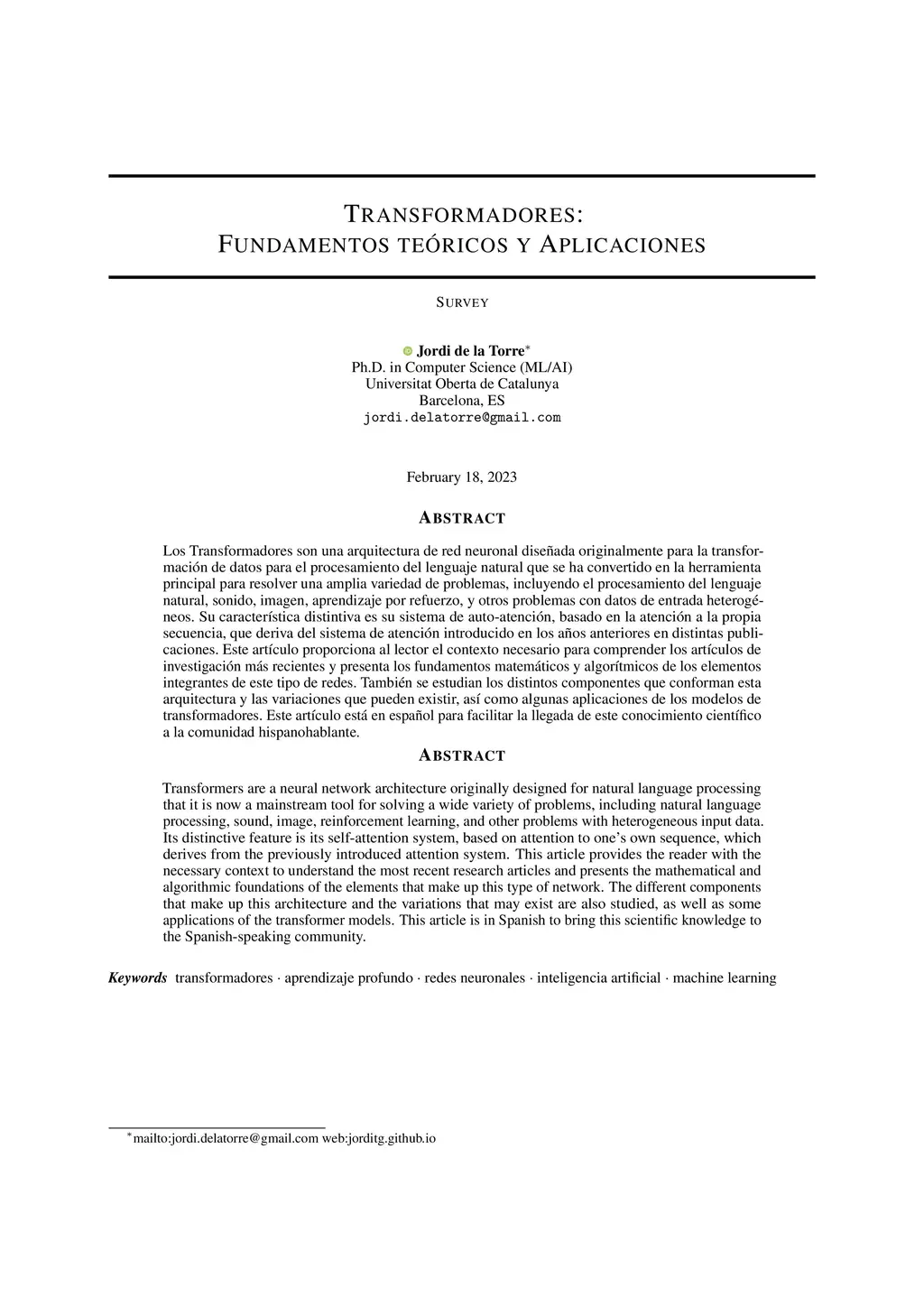 Transformers are a neural network architecture originally developed for natural language processing, which have since become a foundational tool for solving a wide range of problems, including text, audio, image processing, reinforcement learning, and other tasks involving heterogeneous input data. Their hallmark is the self-attention mechanism, which allows the model to weigh different parts of the input sequence dynamically, and is an evolution of earlier attention-based approaches. This article provides readers with the necessary background to understand recent research on transformer models, and presents the mathematical and algorithmic foundations of their core components. It also explores the architecture's various elements, potential modifications, and some of the most relevant applications. The article is written in Spanish to help make this scientific knowledge more accessible to the Spanish-speaking community.