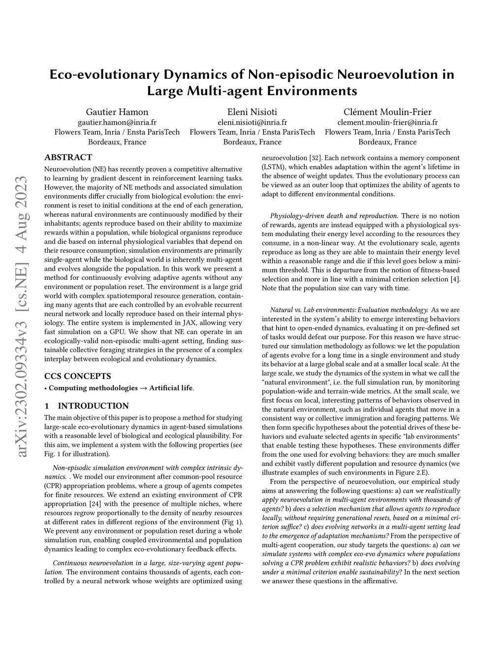 Neuroevolution (NE) has recently proven a competitive alternative to learning by gradient descent in reinforcement learning tasks. However, the majority of NE methods and associated simulation environments differ crucially from biological evolution: the environment is reset to initial conditions at the end of each generation, whereas natural environments are continuously modified by their inhabitants; agents reproduce based on their ability to maximize rewards within a population, while biological organisms reproduce and die based on internal physiological variables that depend on their resource consumption; simulation environments are primarily single-agent while the biological world is inherently multi-agent and evolves alongside the population. In this work we present a method for continuously evolving adaptive agents without any environment or population reset. The environment is a large grid world with complex spatiotemporal resource generation, containing many agents that are each controlled by an evolvable recurrent neural network and locally reproduce based on their internal physiology. The entire system is implemented in JAX, allowing very fast simulation on a GPU. We show that NE can operate in an ecologically-valid non-episodic multi-agent setting, finding sustainable collective foraging strategies in the presence of a complex interplay between ecological and evolutionary dynamics.