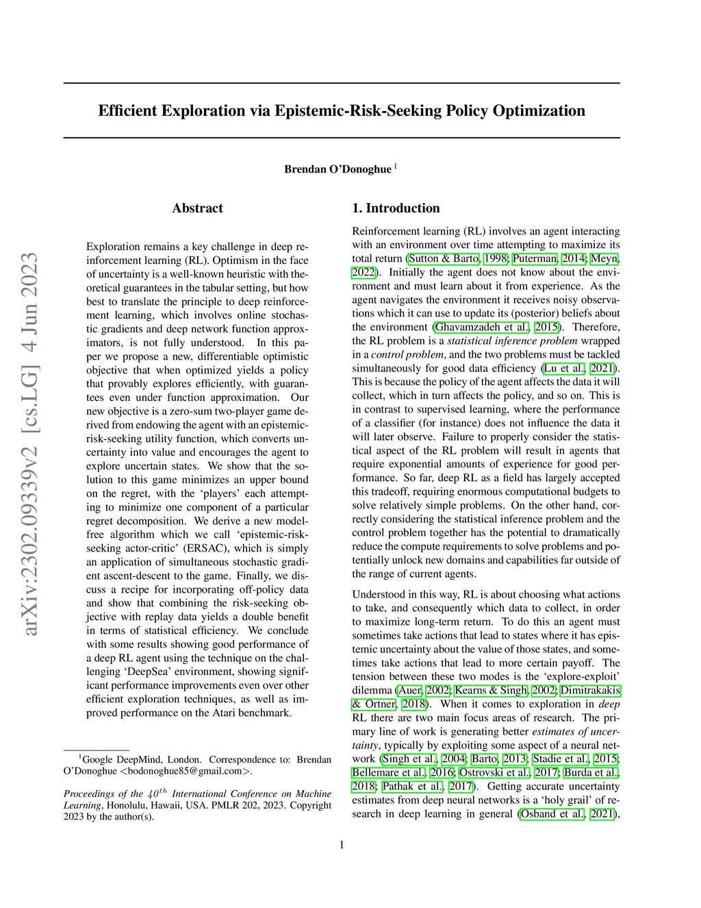 Efficient Exploration via Epistemic-Risk-Seeking Policy Optimization