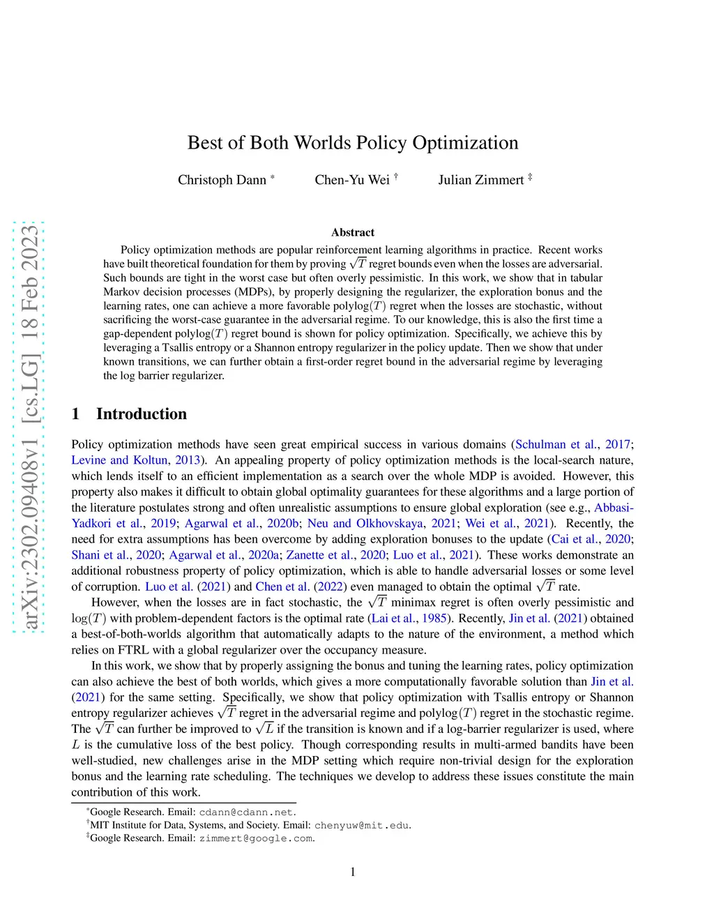 Policy optimization methods are popular reinforcement learning algorithms in practice. Recent works have built theoretical foundation for them by proving regret bounds even when the losses are adversarial. Such bounds are tight in the worst case but often overly pessimistic. In this work, we show that in tabular Markov decision processes (MDPs), by properly designing the regularizer, the exploration bonus and the learning rates, one can achieve a more favorable polylog regret when the losses are stochastic, without sacrificing the worst-case guarantee in the adversarial regime. To our knowledge, this is also the first time a gap-dependent polylog regret bound is shown for policy optimization. Specifically, we achieve this by leveraging a Tsallis entropy or a Shannon entropy regularizer in the policy update. Then we show that under known transitions, we can further obtain a first-order regret bound in the adversarial regime by leveraging the log-barrier regularizer.