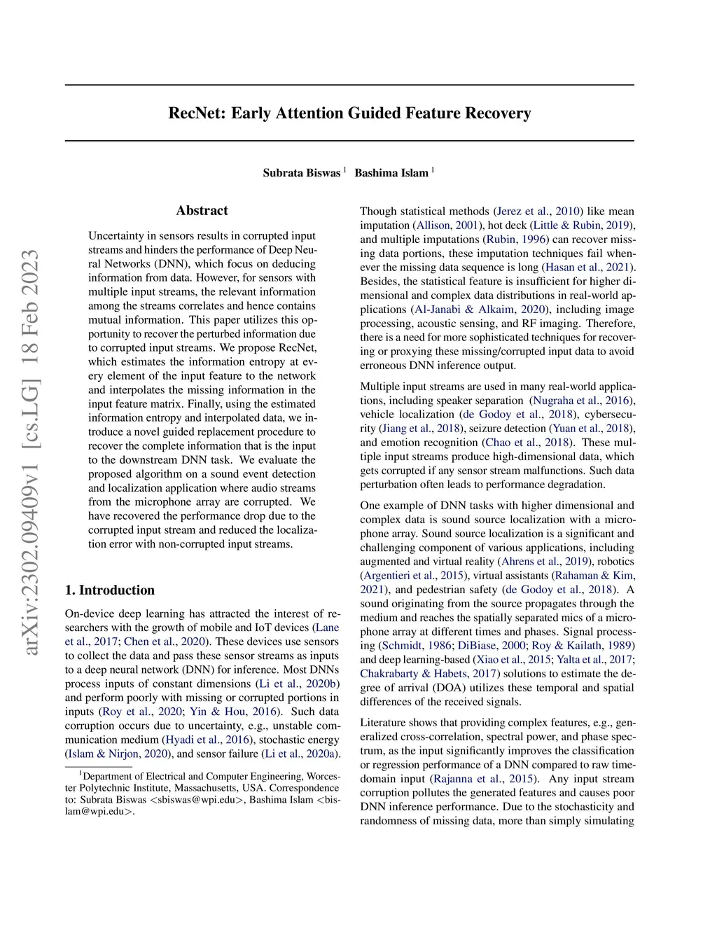 Accurate sound source localization (SSL), such as direction-of-arrival (DoA) estimation, relies on consistent multichannel data. However, batteryless systems often suffer from missing data due to the stochastic nature of energy harvesting, degrading localization performance. We propose LOCUS, a deep learning framework that recovers corrupted features in such settings. LOCUS integrates three modules: (1) Information-Weighted Focus (InFo) to identify corrupted regions, (2) Latent Feature Synthesizer (LaFS) to reconstruct missing features, and (3) Guided Replacement (GRep) to restore data without altering valid inputs. LOCUS significantly improves DoA accuracy under missing-channel conditions, achieving up to 36.91% error reduction on DCASE and LargeSet, and 25.87-59.46% gains in real-world deployments. We release a 50-hour multichannel dataset to support future research on localization under energy constraints. Our code and data are available at:this https URL