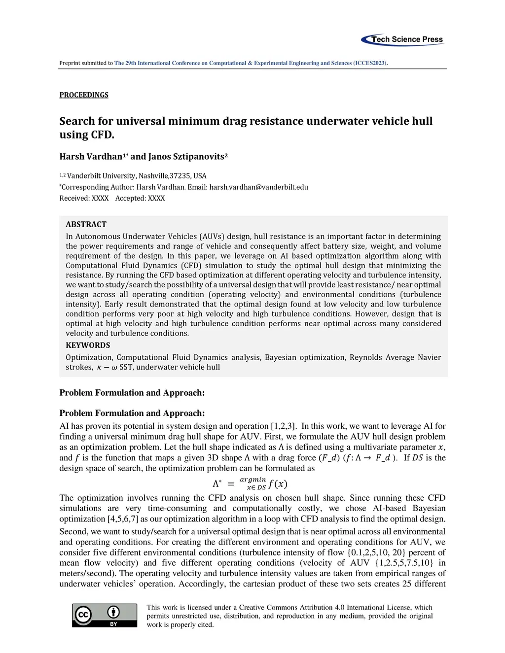 In Autonomous Underwater Vehicles (AUVs) design, hull resistance is an important factor in determining the power requirements and range of vehicle and consequently affect battery size, weight, and volume requirement of the design. In this paper, we leverage on AI-based optimization algorithm along with Computational Fluid Dynamics (CFD) simulation to study the optimal hull design that minimizing the resistance. By running the CFD-based optimization at different operating velocities and turbulence intensity, we want to study/search the possibility of a universal design that will provide least resistance/near-optimal design across all operating conditions (operating velocity) and environmental conditions (turbulence intensity). Early result demonstrated that the optimal design found at low velocity and low turbulence condition performs very poor at high velocity and high turbulence conditions. However, a design that is optimal at high velocity and high turbulence conditions performs near-optimal across many considered velocity and turbulence conditions.