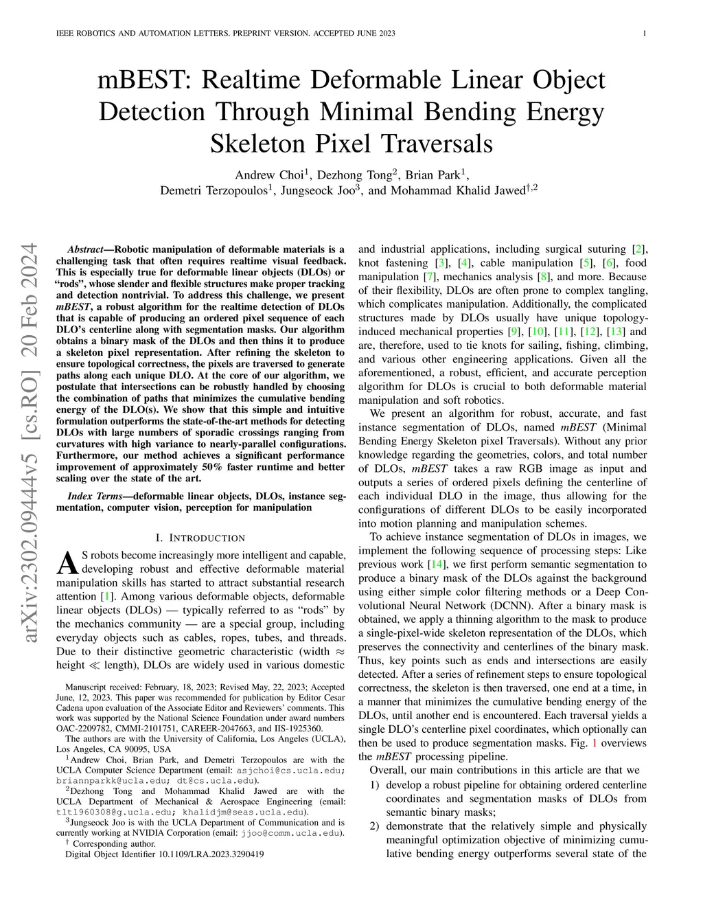 Robotic manipulation of deformable materials is a challenging task that often requires realtime visual feedback. This is especially true for deformable linear objects (DLOs) or "rods", whose slender and flexible structures make proper tracking and detection nontrivial. To address this challenge, we present mBEST, a robust algorithm for the realtime detection of DLOs that is capable of producing an ordered pixel sequence of each DLO's centerline along with segmentation masks. Our algorithm obtains a binary mask of the DLOs and then thins it to produce a skeleton pixel representation. After refining the skeleton to ensure topological correctness, the pixels are traversed to generate paths along each unique DLO. At the core of our algorithm, we postulate that intersections can be robustly handled by choosing the combination of paths that minimizes the cumulative bending energy of the DLO(s). We show that this simple and intuitive formulation outperforms the state-of-the-art methods for detecting DLOs with large numbers of sporadic crossings ranging from curvatures with high variance to nearly-parallel configurations. Furthermore, our method achieves a significant performance improvement of approximately 50% faster runtime and better scaling over the state of the art.