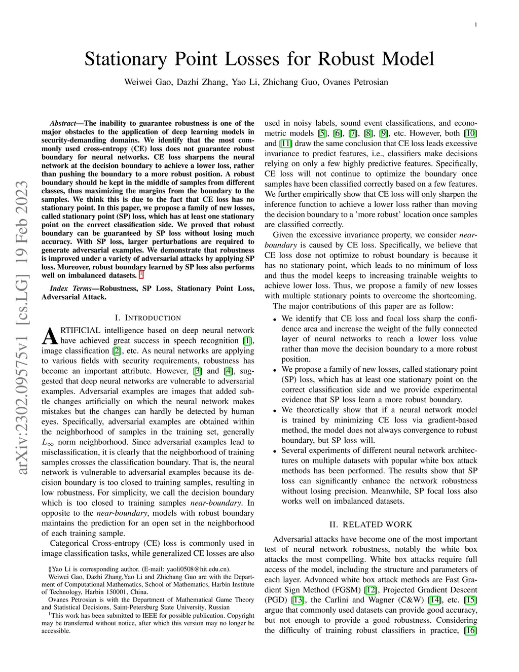 The inability to guarantee robustness is one of the major obstacles to the application of deep learning models in security-demanding domains. We identify that the most commonly used cross-entropy (CE) loss does not guarantee robust boundary for neural networks. CE loss sharpens the neural network at the decision boundary to achieve a lower loss, rather than pushing the boundary to a more robust position. A robust boundary should be kept in the middle of samples from different classes, thus maximizing the margins from the boundary to the samples. We think this is due to the fact that CE loss has no stationary point. In this paper, we propose a family of new losses, called stationary point (SP) loss, which has at least one stationary point on the correct classification side. We proved that robust boundary can be guaranteed by SP loss without losing much accuracy. With SP loss, larger perturbations are required to generate adversarial examples. We demonstrate that robustness is improved under a variety of adversarial attacks by applying SP loss. Moreover, robust boundary learned by SP loss also performs well on imbalanced datasets.