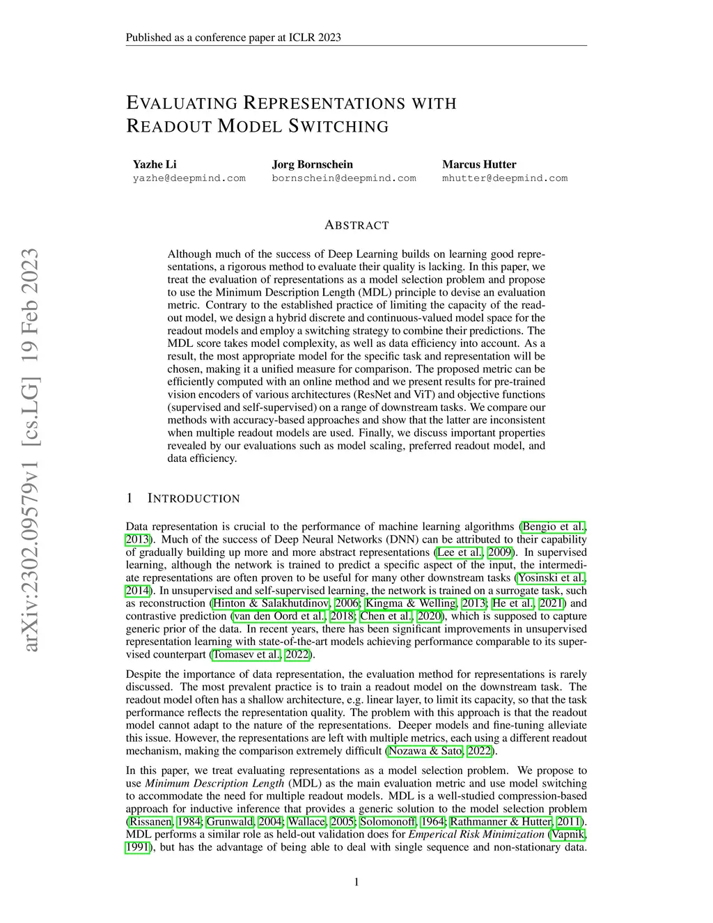 Although much of the success of Deep Learning builds on learning good representations, a rigorous method to evaluate their quality is lacking. In this paper, we treat the evaluation of representations as a model selection problem and propose to use the Minimum Description Length (MDL) principle to devise an evaluation metric. Contrary to the established practice of limiting the capacity of the readout model, we design a hybrid discrete and continuous-valued model space for the readout models and employ a switching strategy to combine their predictions. The MDL score takes model complexity, as well as data efficiency into account. As a result, the most appropriate model for the specific task and representation will be chosen, making it a unified measure for comparison. The proposed metric can be efficiently computed with an online method and we present results for pre-trained vision encoders of various architectures (ResNet and ViT) and objective functions (supervised and self-supervised) on a range of downstream tasks. We compare our methods with accuracy-based approaches and show that the latter are inconsistent when multiple readout models are used. Finally, we discuss important properties revealed by our evaluations such as model scaling, preferred readout model, and data efficiency.