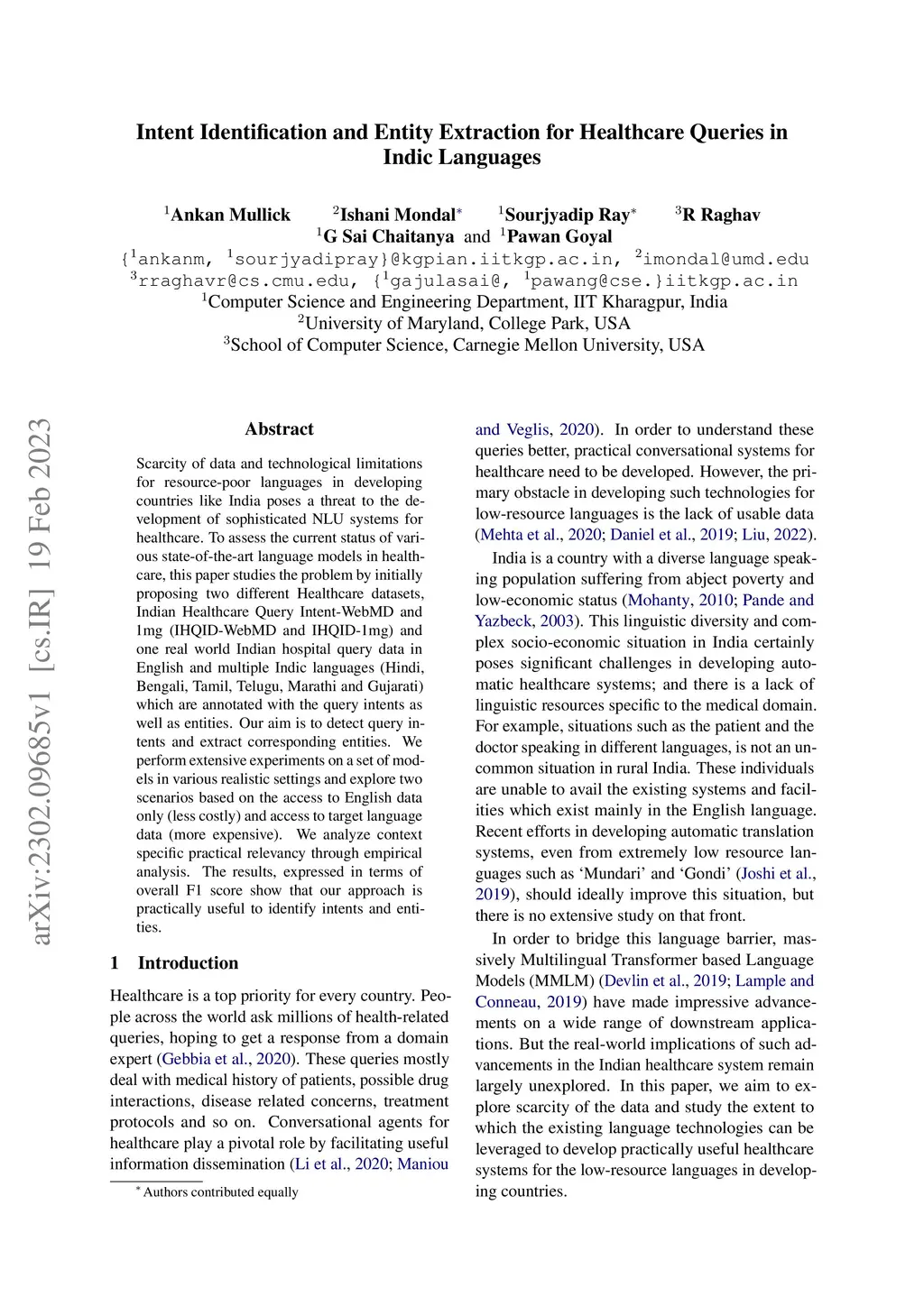 Intent Identification and Entity Extraction for Healthcare Queries in