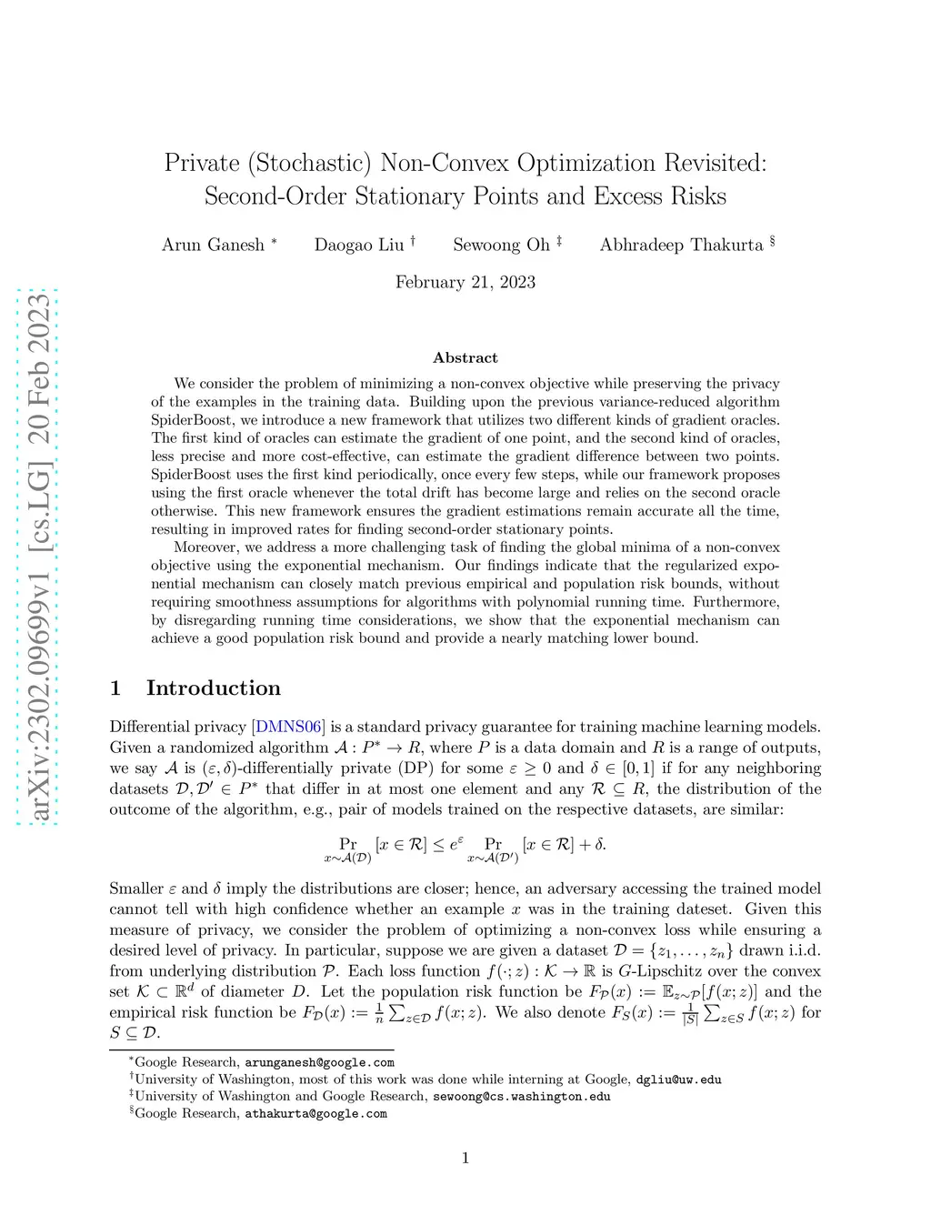 We consider the problem of minimizing a non-convex objective while preserving the privacy of the examples in the training data. Building upon the previous variance-reduced algorithm SpiderBoost, we introduce a new framework that utilizes two different kinds of gradient oracles. The first kind of oracles can estimate the gradient of one point, and the second kind of oracles, less precise and more cost-effective, can estimate the gradient difference between two points. SpiderBoost uses the first kind periodically, once every few steps, while our framework proposes using the first oracle whenever the total drift has become large and relies on the second oracle otherwise. This new framework ensures the gradient estimations remain accurate all the time, resulting in improved rates for finding second-order stationary points. Moreover, we address a more challenging task of finding the global minima of a non-convex objective using the exponential mechanism. Our findings indicate that the regularized exponential mechanism can closely match previous empirical and population risk bounds, without requiring smoothness assumptions for algorithms with polynomial running time. Furthermore, by disregarding running time considerations, we show that the exponential mechanism can achieve a good population risk bound and provide a nearly matching lower bound.