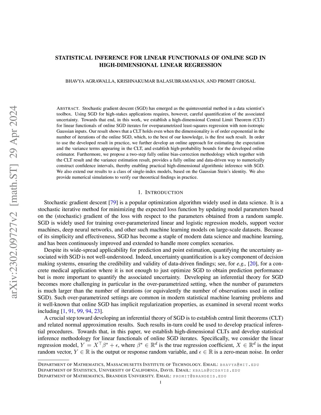 Stochastic gradient descent (SGD) has emerged as the quintessential method in a data scientist's toolbox. Using SGD for high-stakes applications requires, however, careful quantification of the associated uncertainty. Towards that end, in this work, we establish a high-dimensional Central Limit Theorem (CLT) for linear functionals of online SGD iterates for overparametrized least-squares regression with non-isotropic Gaussian inputs. We first show that a bias-corrected CLT holds when the number of iterations of the online SGD, , grows sub-linearly in the dimensionality, . In order to use the developed result in practice, we further develop an online approach for estimating the variance term appearing in the CLT, and establish high-probability bounds for the developed online estimator. Together with the CLT result, this provides a fully online and data-driven way to numerically construct confidence intervals. This enables practical high-dimensional algorithmic inference with SGD and to the best of our knowledge, is the first such result.