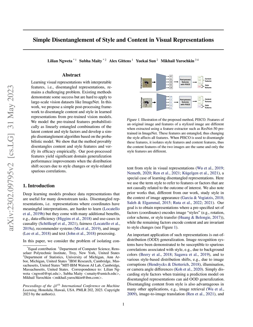 Learning visual representations with interpretable features, i.e., disentangled representations, remains a challenging problem. Existing methods demonstrate some success but are hard to apply to large-scale vision datasets like ImageNet. In this work, we propose a simple post-processing framework to disentangle content and style in learned representations from pre-trained vision models. We model the pre-trained features probabilistically as linearly entangled combinations of the latent content and style factors and develop a simple disentanglement algorithm based on the probabilistic model. We show that the method provably disentangles content and style features and verify its efficacy empirically. Our post-processed features yield significant domain generalization performance improvements when the distribution shift occurs due to style changes or style-related spurious correlations.