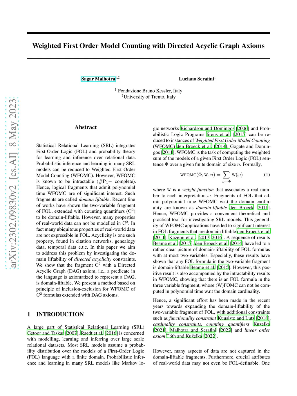Statistical Relational Learning (SRL) integrates First-Order Logic (FOL) and probability theory for learning and inference over relational data. Probabilistic inference and learning in many SRL models can be reduced to Weighted First Order Model Counting (WFOMC). However, WFOMC is known to be intractable ( complete). Hence, logical fragments that admit polynomial time WFOMC are of significant interest. Such fragments are called domain liftable. Recent line of works have shown the two-variable fragment of FOL, extended with counting quantifiers () to be domain-liftable. However, many properties of real-world data can not be modelled in . In fact many ubiquitous properties of real-world data are inexressible in FOL. Acyclicity is one such property, found in citation networks, genealogy data, temporal data e.t.c. In this paper we aim to address this problem by investigating the domain liftability of directed acyclicity constraints. We show that the fragment with a Directed Acyclic Graph (DAG) axiom, i.e., a predicate in the language is axiomatized to represent a DAG, is domain-liftable. We present a method based on principle of inclusion-exclusion for WFOMC of formulas extended with DAG axioms.